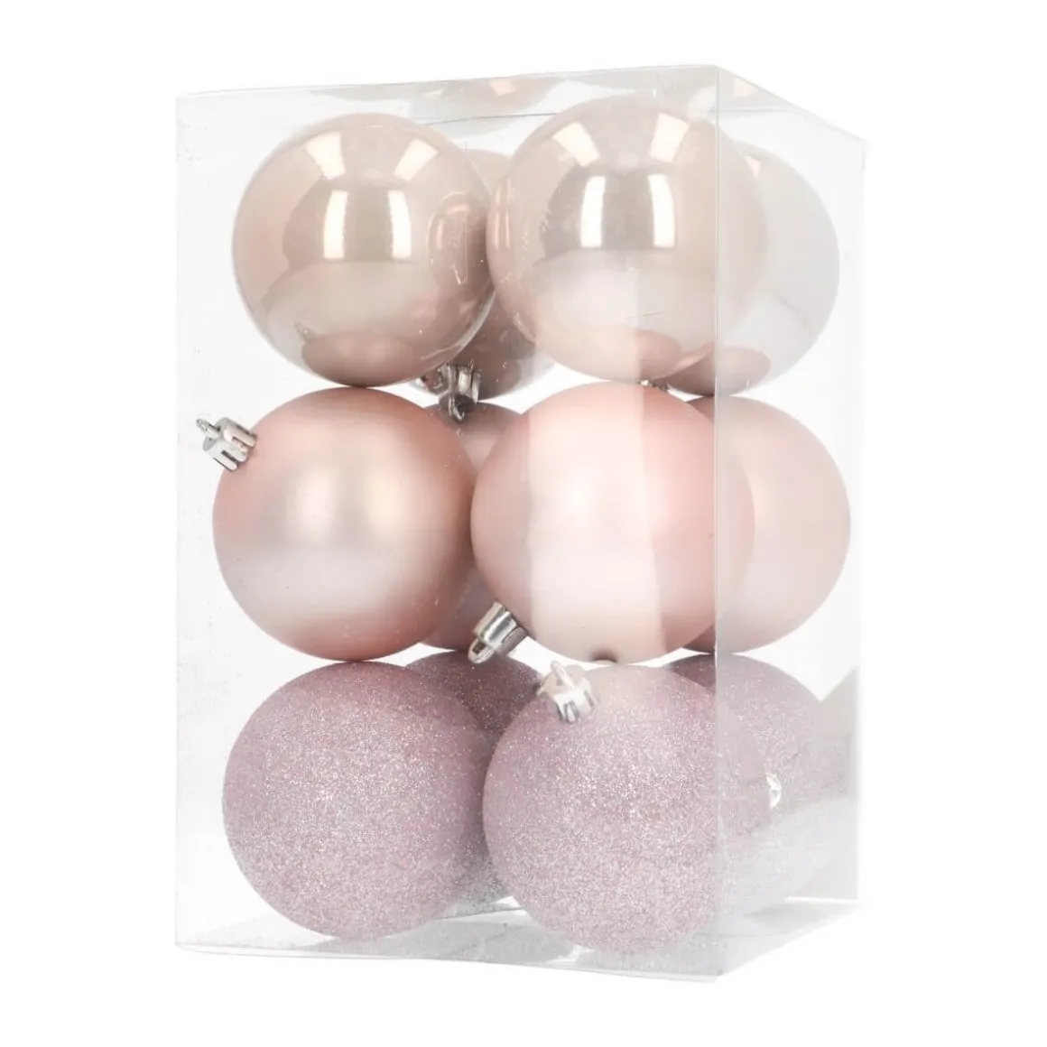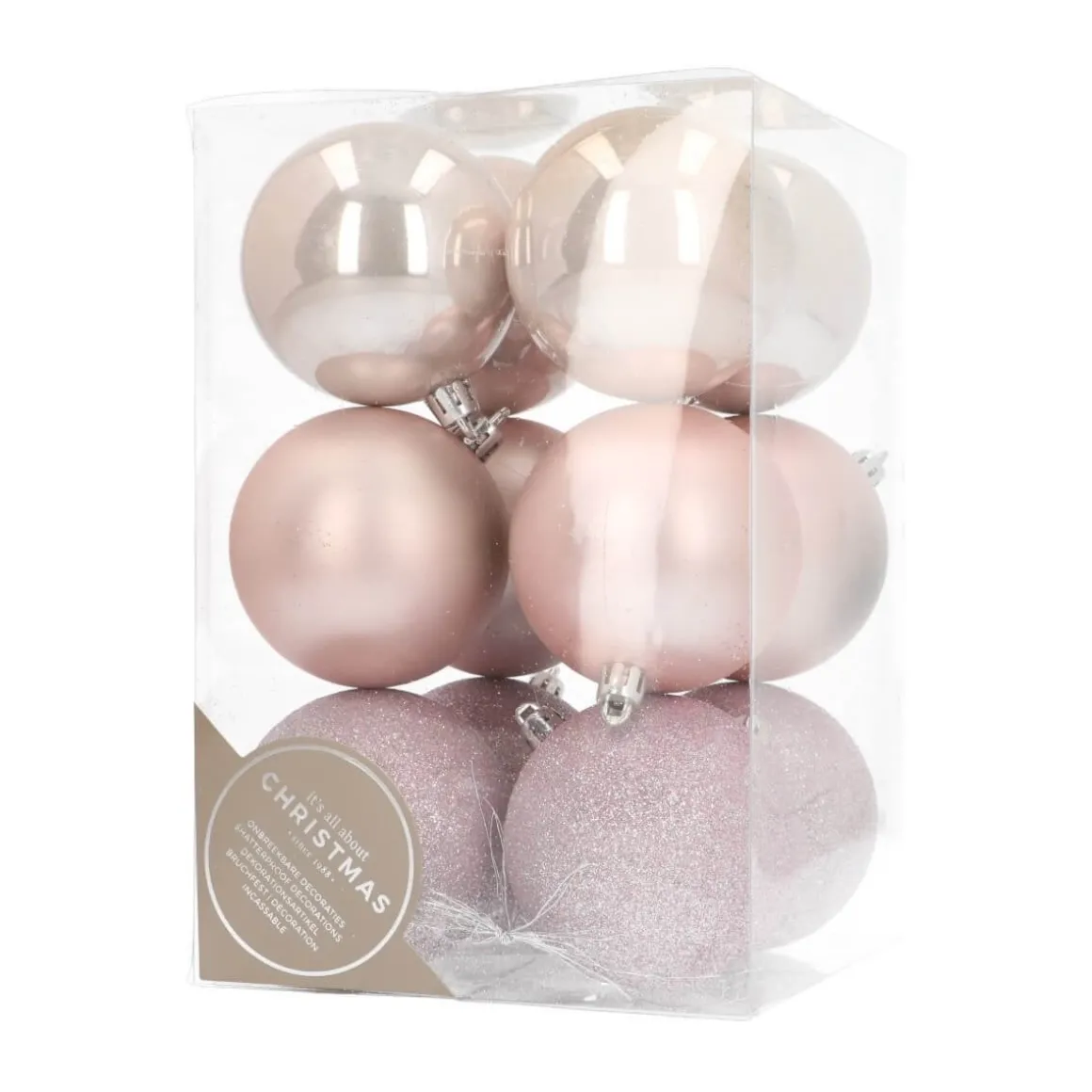 Mooie set van 12 kunststof kerstballen, zachtroze. De kerstballen hebben een doorsnede van 7 cm. Door meerdere sets te combineren, bijvoorbeeld met andere kleuren en maten, kun je je eigen unieke stijl creëren. Omdat ze van plastic zijn gemaakt, zijn ze praktisch onbreekbaar. Kleurcategorie: roze.