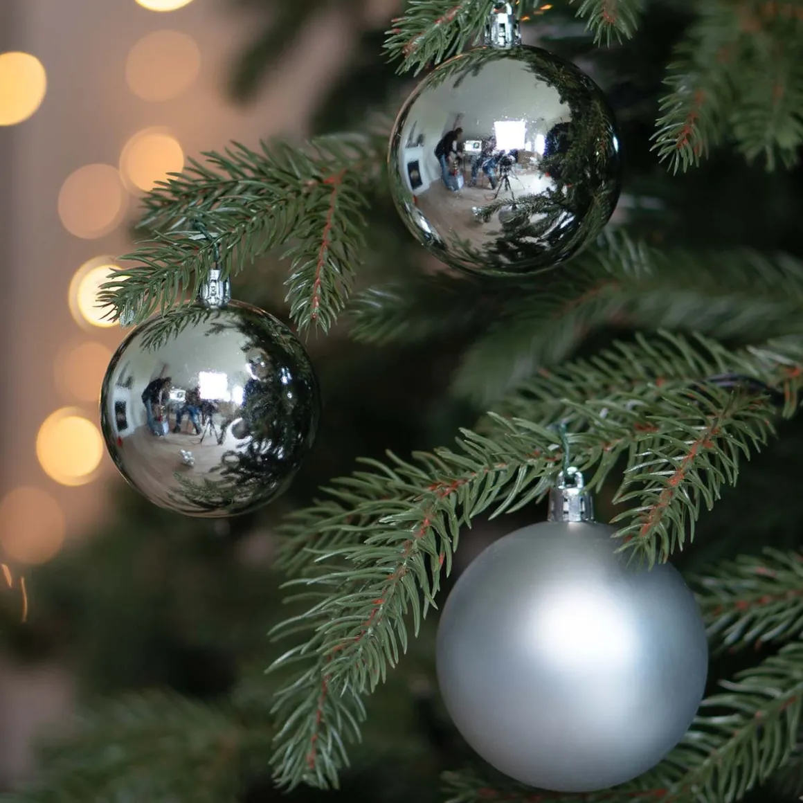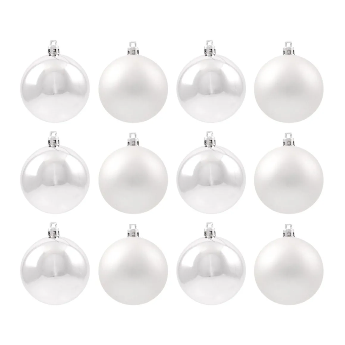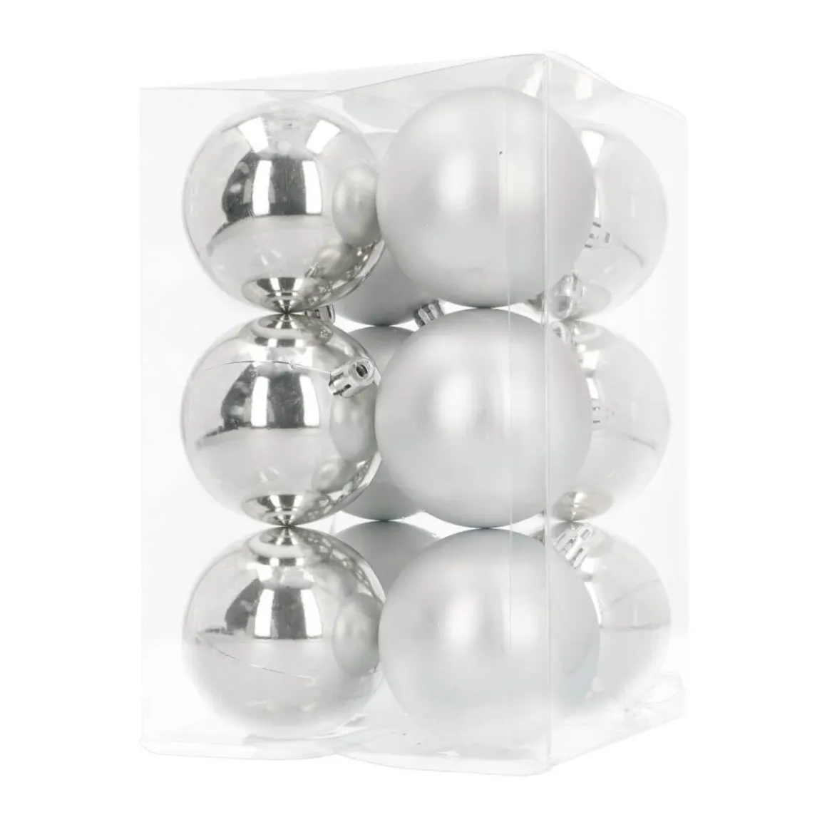 Mooie set van 12 kunststof kerstballen, zilver. De kerstballen hebben een doorsnede van 7 cm. Door meerdere sets te combineren, bijvoorbeeld met andere kleuren en maten, kun je je eigen unieke stijl creëren. Omdat ze van plastic zijn gemaakt, zijn ze praktisch onbreekbaar. Kleurcategorie: zilver.