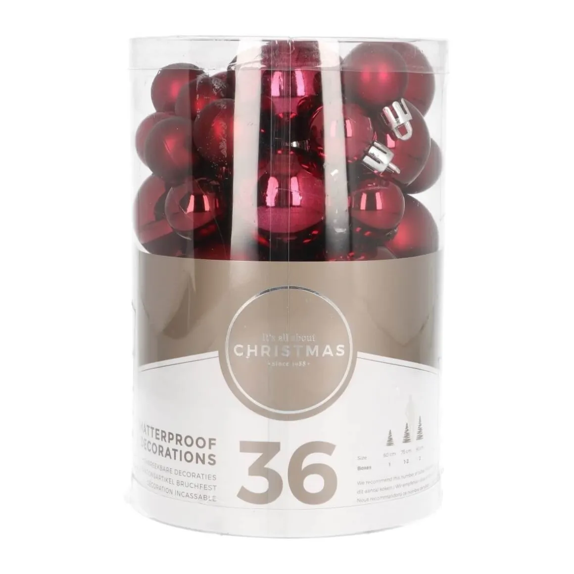 Zeer complete set van 36 kleine kunststof kerstballen, bordeauxrood. De set bestaat uit 16 ballen met een doorsnede van 2,5 cm, 12 ballen van 4 cm, en 8 ballen van 5 cm. Gebruik meerdere sets in dezelfde kleur voor een rustige sfeer, of combineer met andere kleuren voor je eigen unieke stijl. Geleverd in een handige koker, waarin de kerstballen na de kerst veilig op te bergen zijn. Omdat de kerstballen van plastic zijn gemaakt, zijn ze praktisch onbreekbaar. Kleurcategorie: rood.