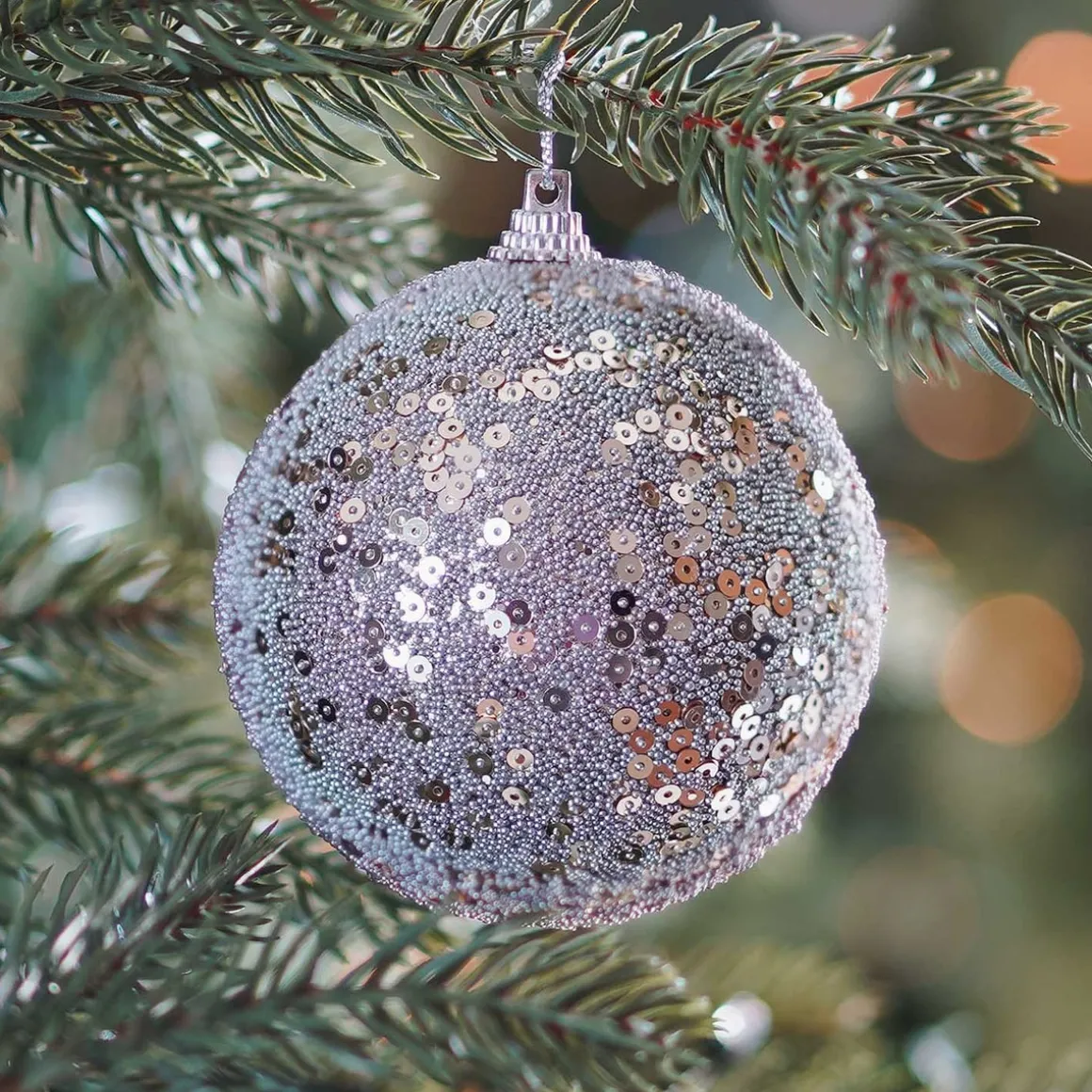 Decoratieve kerstbal die versierd is met pailletten in de kleur champagne. De bal is 8cm groot. Dankzij de pailletten zal deze kerstbal prachtig glinsteren in de kerstboom. Leuk om te combineren met andere champagnekleurige kerstballen en ornamenten. Gemaakt van polystyreenschuim en is niet breekbaar.