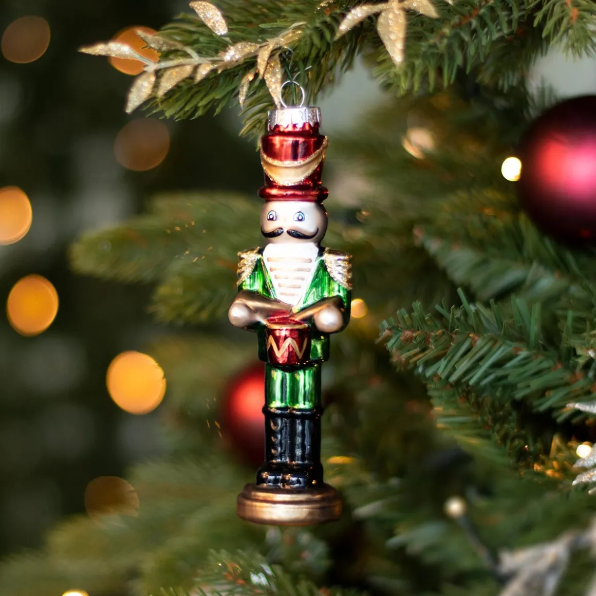 Luxe kerstboomhanger notenkraker met trommel in rood en groen, gemaakt van glas. Deze 15 cm grotenotenkraker is een prachtige aanvulling op iedere kerstboom.