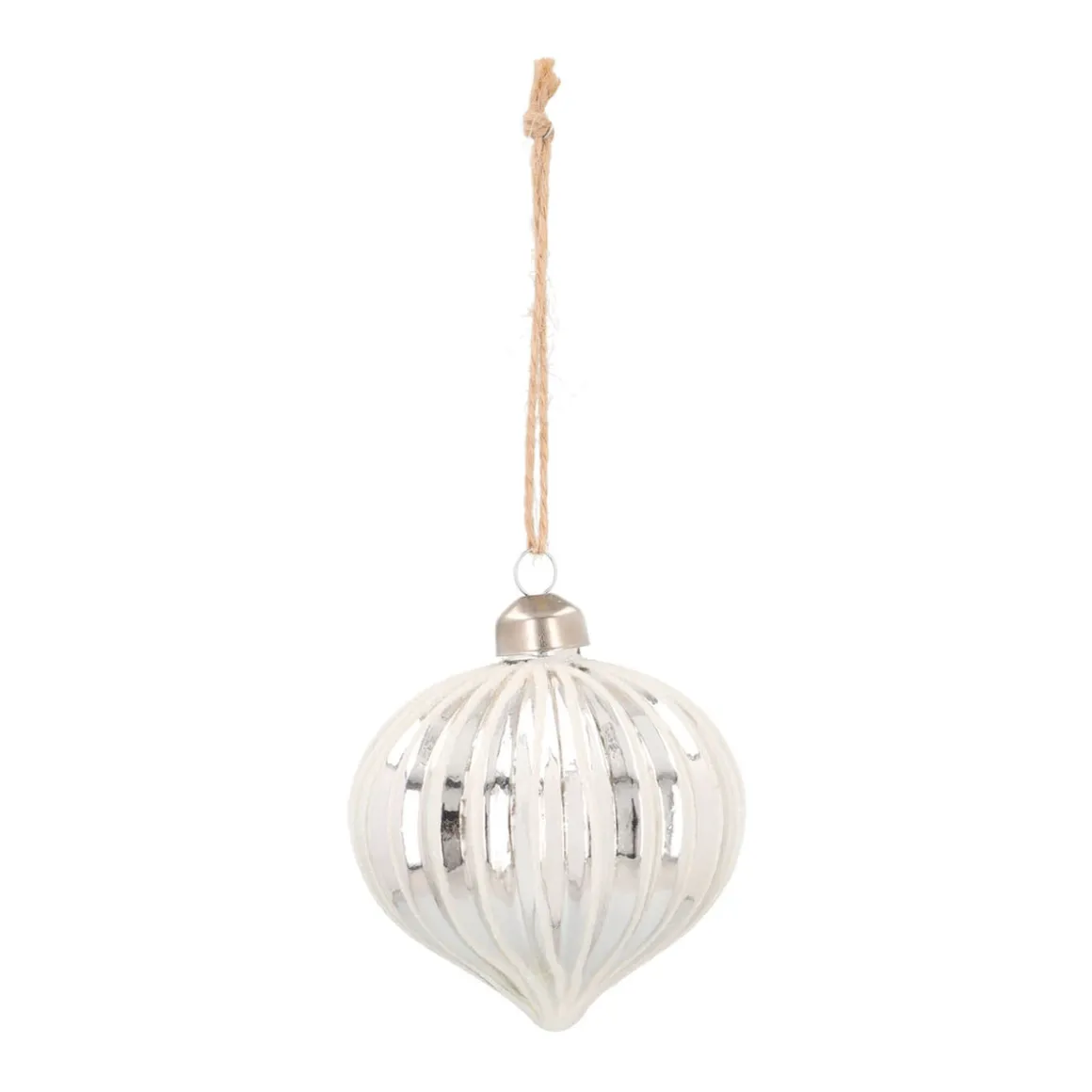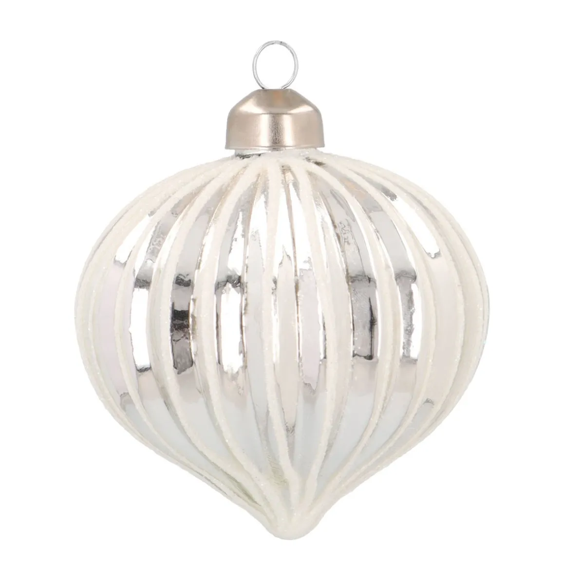 Glazen kerstbal in prachtig zilver en voorzien van stijlvolle lijnenDe witte glitters op deze ui-vorm kerstbal maken ‘m helemaal af..