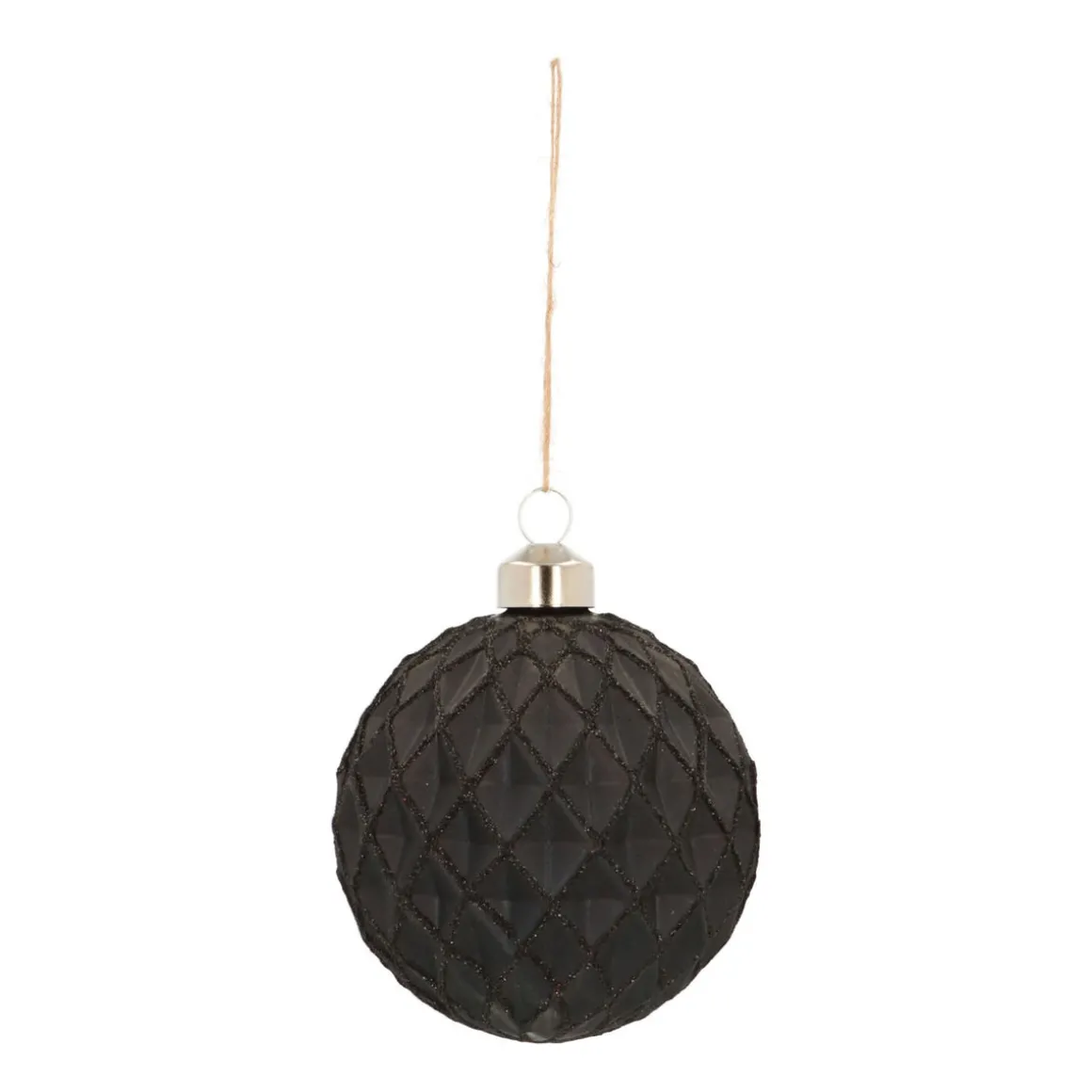 Glazen kerstbal in chique zwarte kleur, voorzien van stijlvol ruitjespatroon en een relief. De lijnen zijn voorzien van een subtiel laagje glitter.