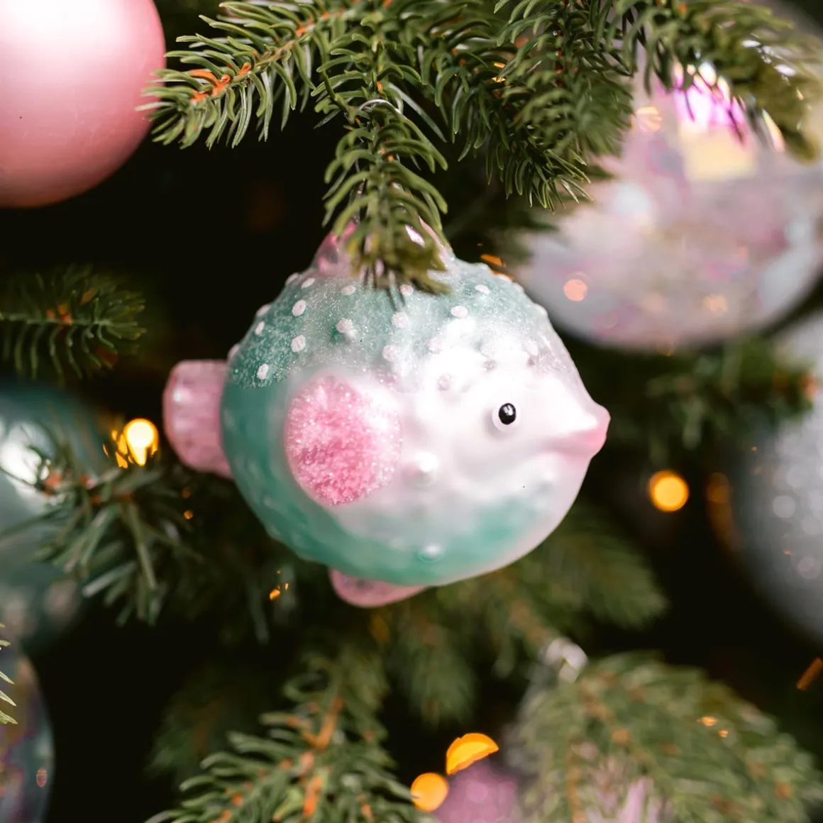 Luxe kerstboomhanger kogelvis in groen-roze, gemaakt van glas. Deze 11cm grote kogelvis is een buitengewone kerstboomversiering en een absolute blikvanger!