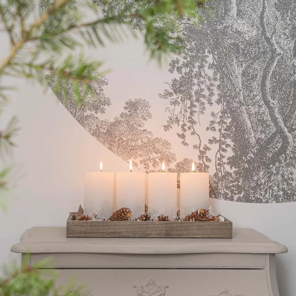 Decoratieve houten presenteerplank met grey wash. Bijzonder leuk om te decoreren met de mooiste kersversieringen zoals onze prachtige waxinelichthouders, mini kerstboompjes en kerstfiguren.