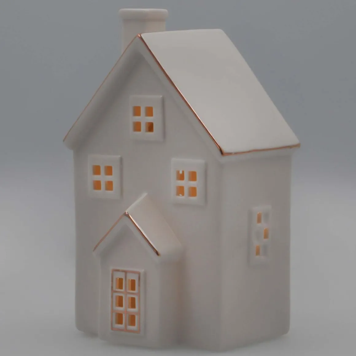 Laat je woonkamer schitteren met dit prachtige witte porseleinen huis met led-verlichting! Met een hoogte van 20cm en inclusief batterijen is dit huisje klaar om je kerstsfeer te verlichten. Dit witte huis heeft een gouden randje langs de dakgoot wat het een extra touch geeft.