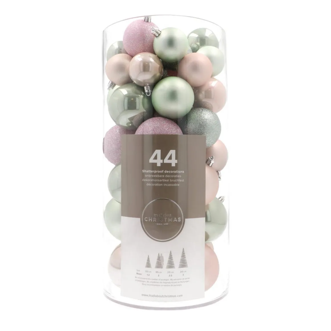Complete set van 44 kunststof kerstballen in prachtige ‘Romantic’ mix. De set bevat matte, glitter en glanzende ballen en wordt geleverd in een handige opbergkoker.