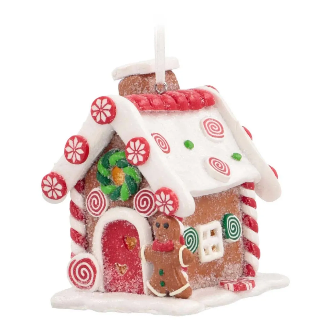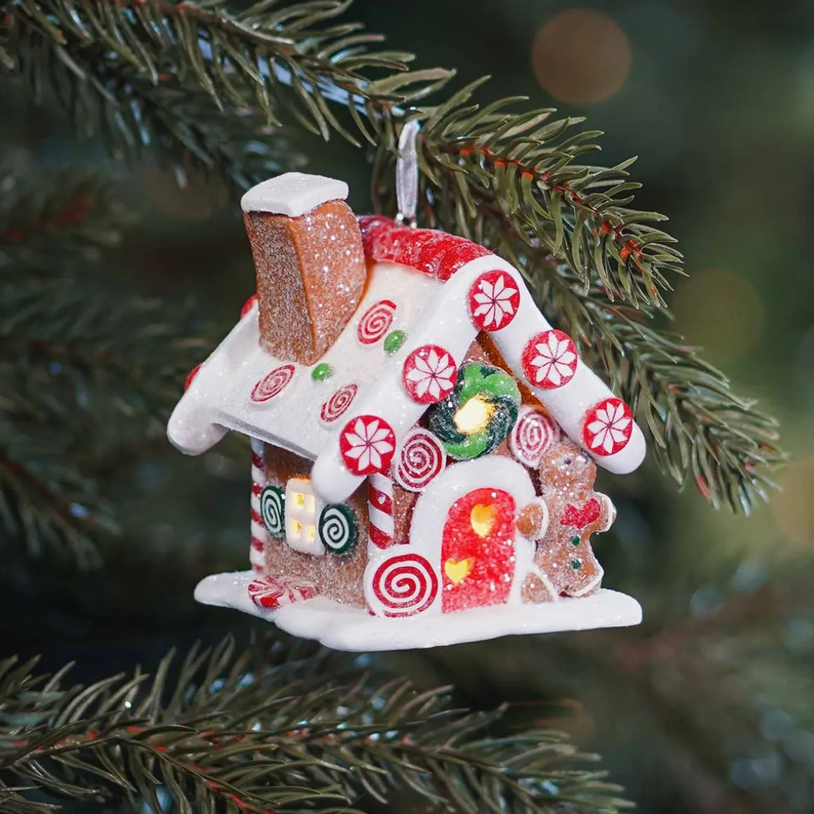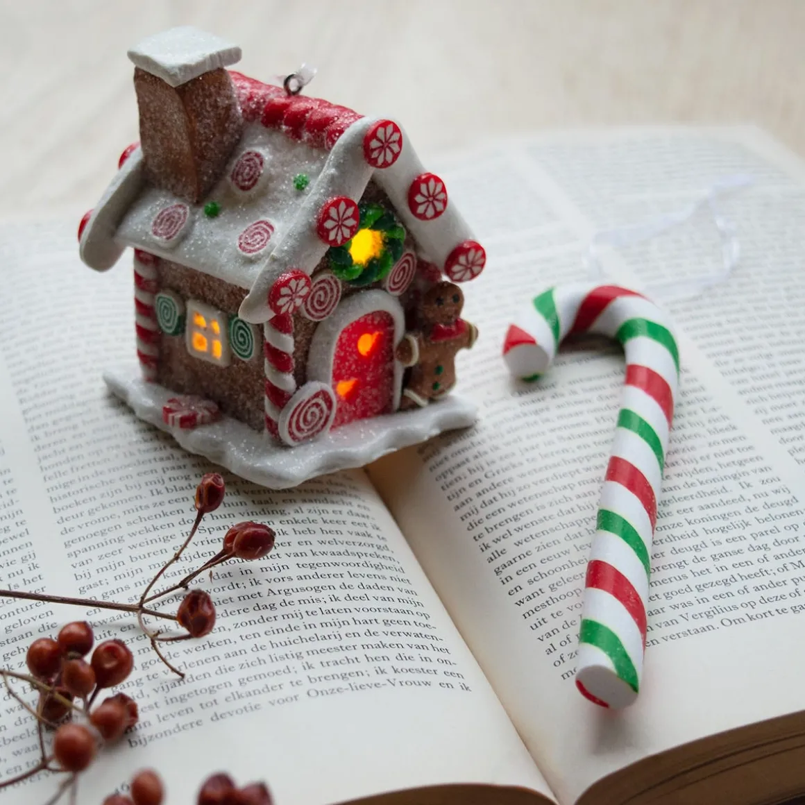 Mooie kersthanger van een een snoephuisje met LED verlichting, handgemaakt van klei.