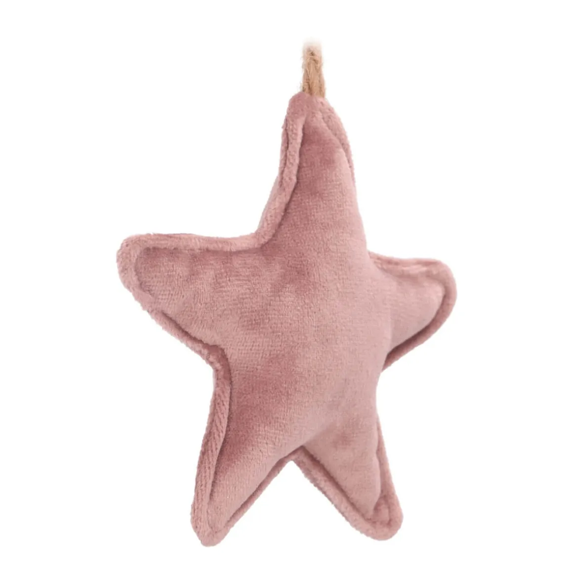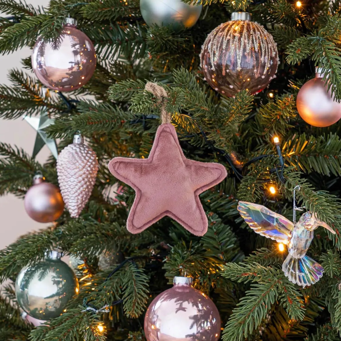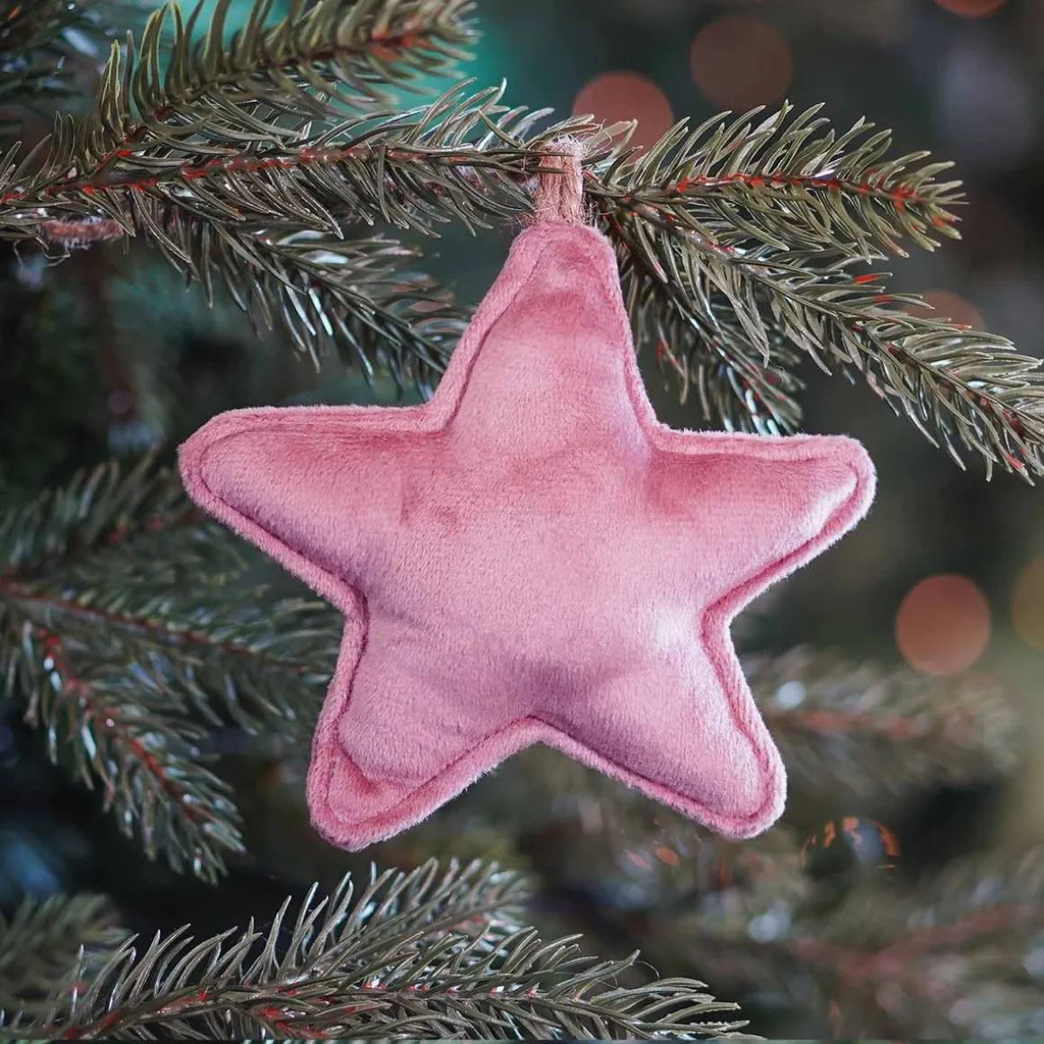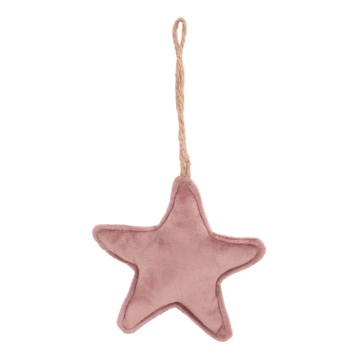 Luxe stoffen kerstboomhanger ster. Deze ster heeft een prachtig roze kleur en is gemaakt van de zachte stof flanel. Voorzien van een rustiek jute ophangkoordje.