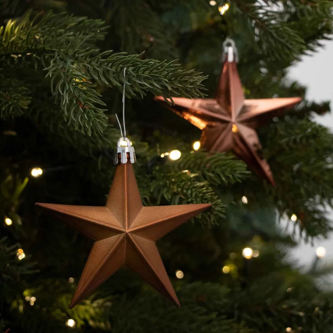 Prachtige set van 12 sterren voor de kerstboom in de kleur brons. Inbegrepen zijn matte, glanzende en glinsterende sterren van 10 cm, gemaakt van robuust plastic.