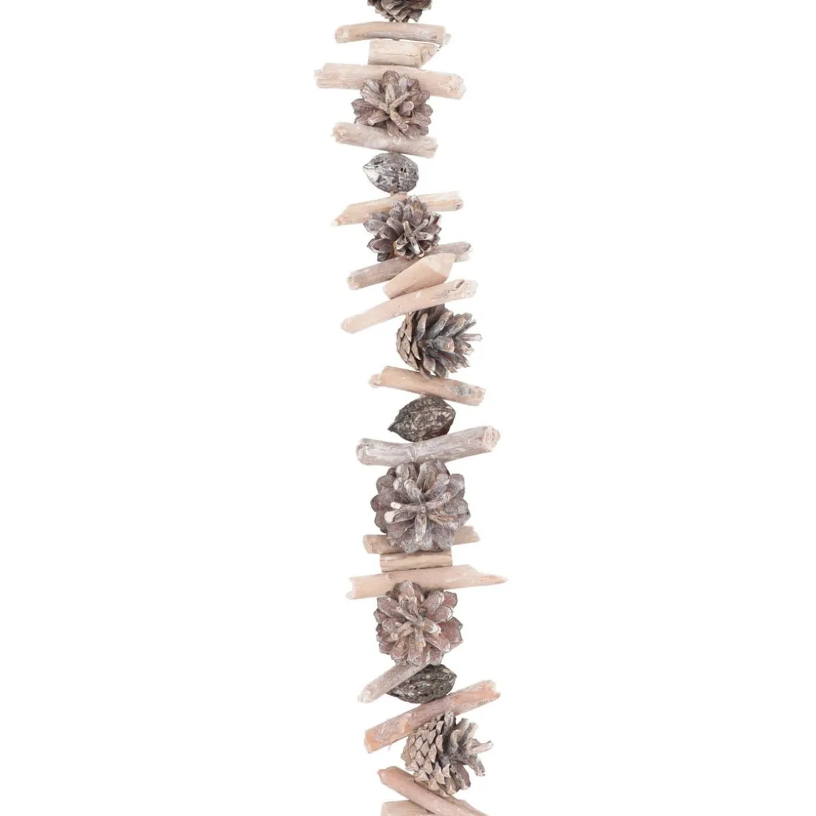 Prachtige kerstslinger met houten stokjes, dennenappels, noten en white wash finish. Deze bijzonder sierlijke slinger van 100 cm staat ook mooi als guirlande in de kerstboom.