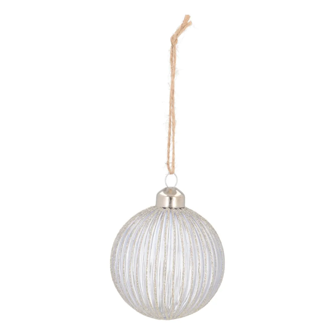 Deze transparante glazen kerstbal heeft een diameter van 8 cm en is gevormd in een elegant lampionreliëf. Dit reliëf en de zilveren glitters geven extra glamour aan je kerstboom. De strepen en de glitters en worden namelijk extra benadrukt door de kerstlampjes. Het standaard kerstboomhaakje heeft bij dit exemplaar plaats gemaakt voor een jute touwtje. Leuk detail: de vele glitters zijn met de hand op het glas aangebracht, dus elke bal is anders!