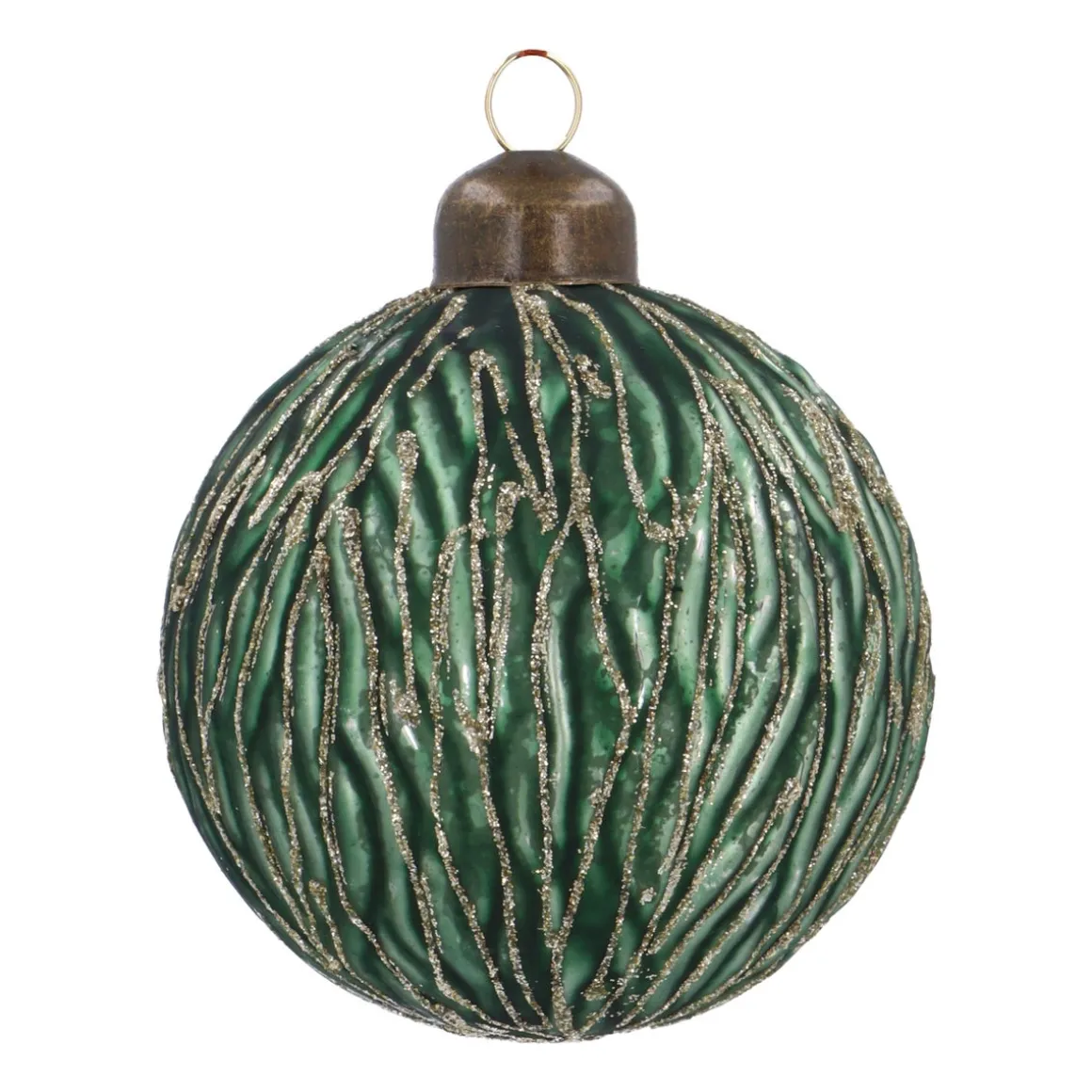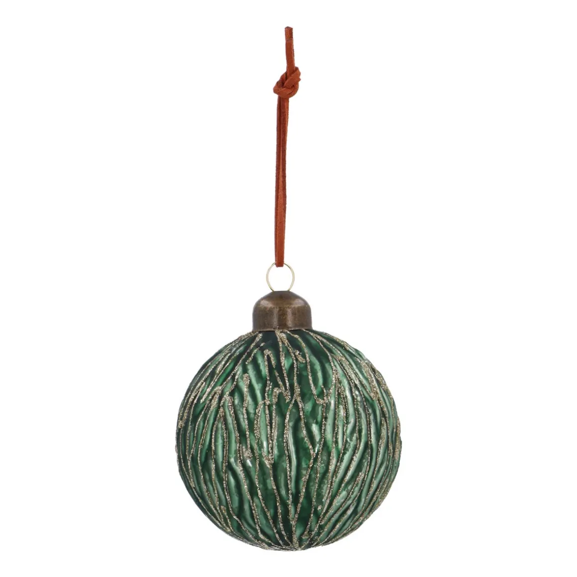 Deze prachtige kerstbal, met een diameter van 8 cm, straalt een rustige en stijlvolle sfeer uit. De matgroene kleur met subtiele, organische lijnen geeft een natuurlijke uitstraling aan je kerstboom. Het bruine leren touwtje en de verweerde look maken het geheel helemaal af. Bovendien zorgt de mooie lichtweerkaatsing ervoor dat deze bal in elke kerstboom schittert.