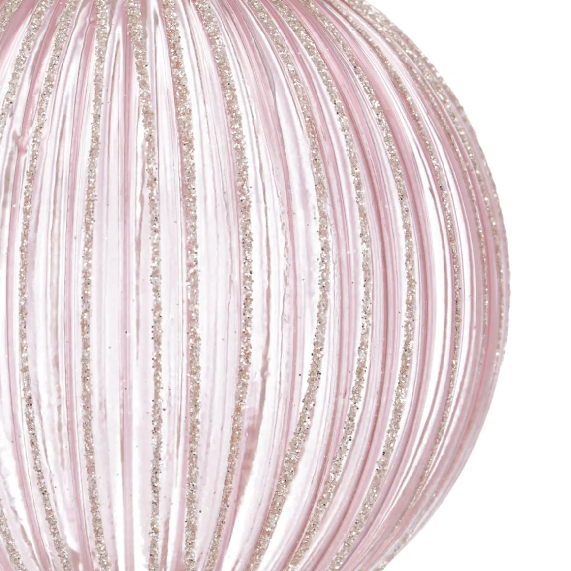 Met een diameter van 8 cm en fijne verticale reliefstrepen die zijn versierd met glitters, zorgt deze kerstbal voor een subtiel en sprankelend effect. Het zilveren kroontje en het witte lintje maken het plaatje helemaal af. Perfect om je kerstboom een romantische touch te geven.