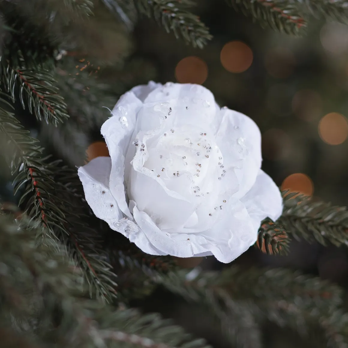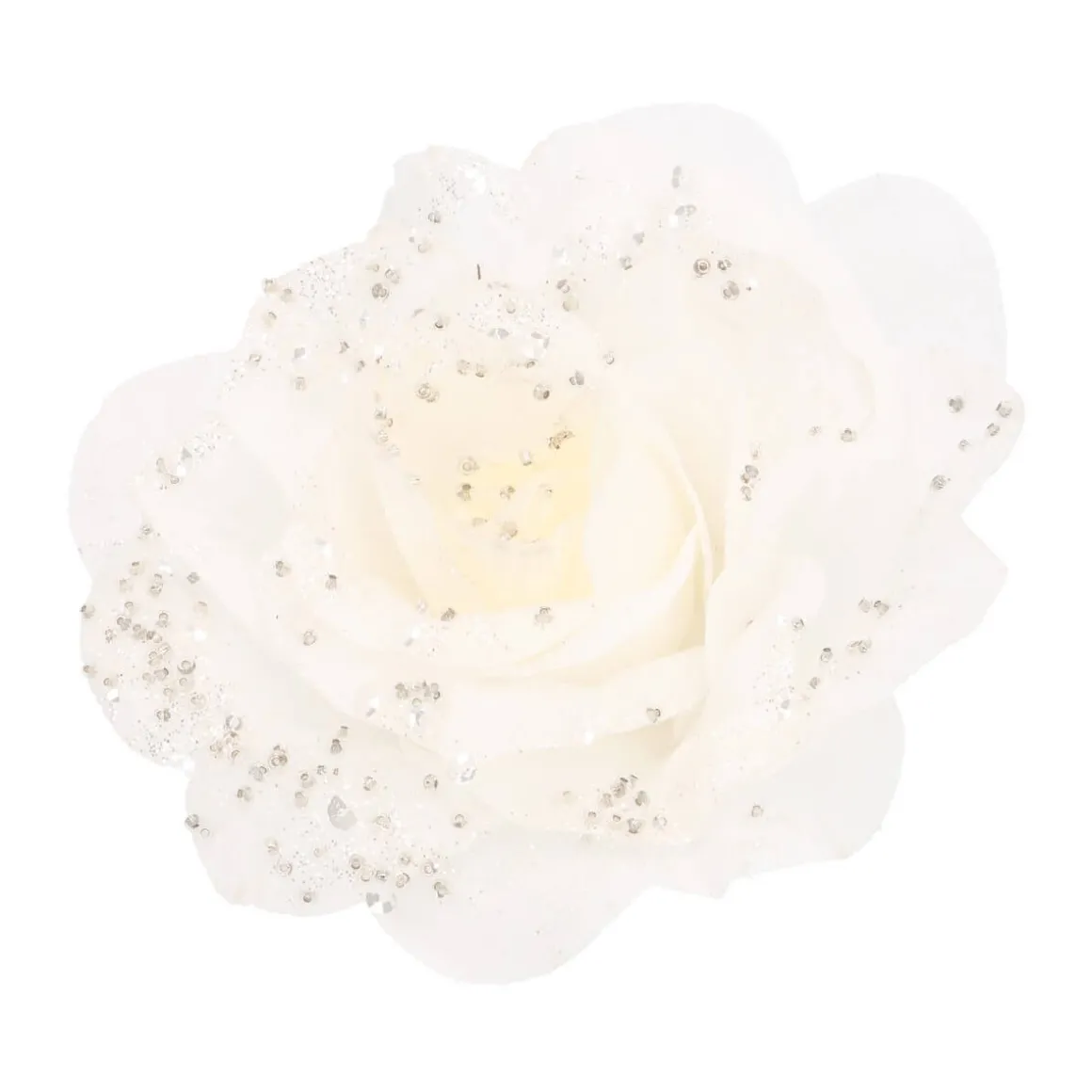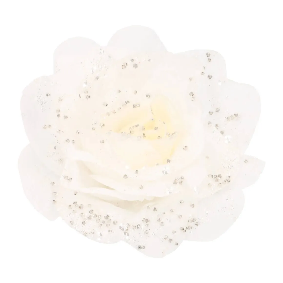Decoratieve witte roos op clip, met een doorsnede van ongeveer 12 cm. Voorzien van glitters. Door het klemmetje eenvoudig te bevestigen in bijvoorbeeld de kerstboom.