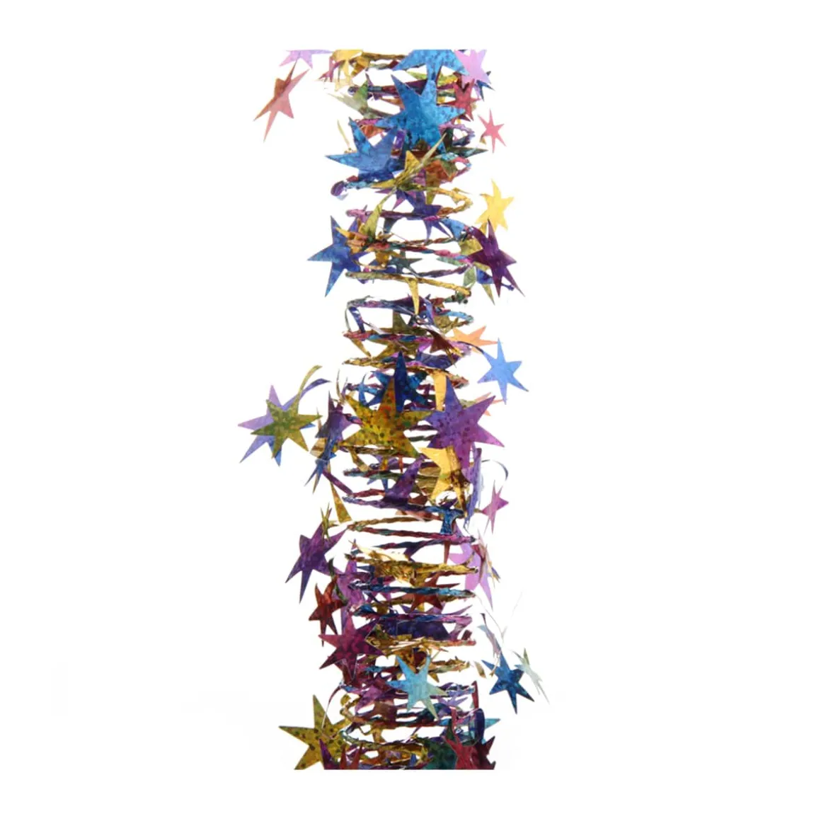 Fraaie spiraalslinger met sterren in de kleur regenboog/multi, laser. De slinger is 750cm lang. Zeer decoratief in kerstboom of guirlande.