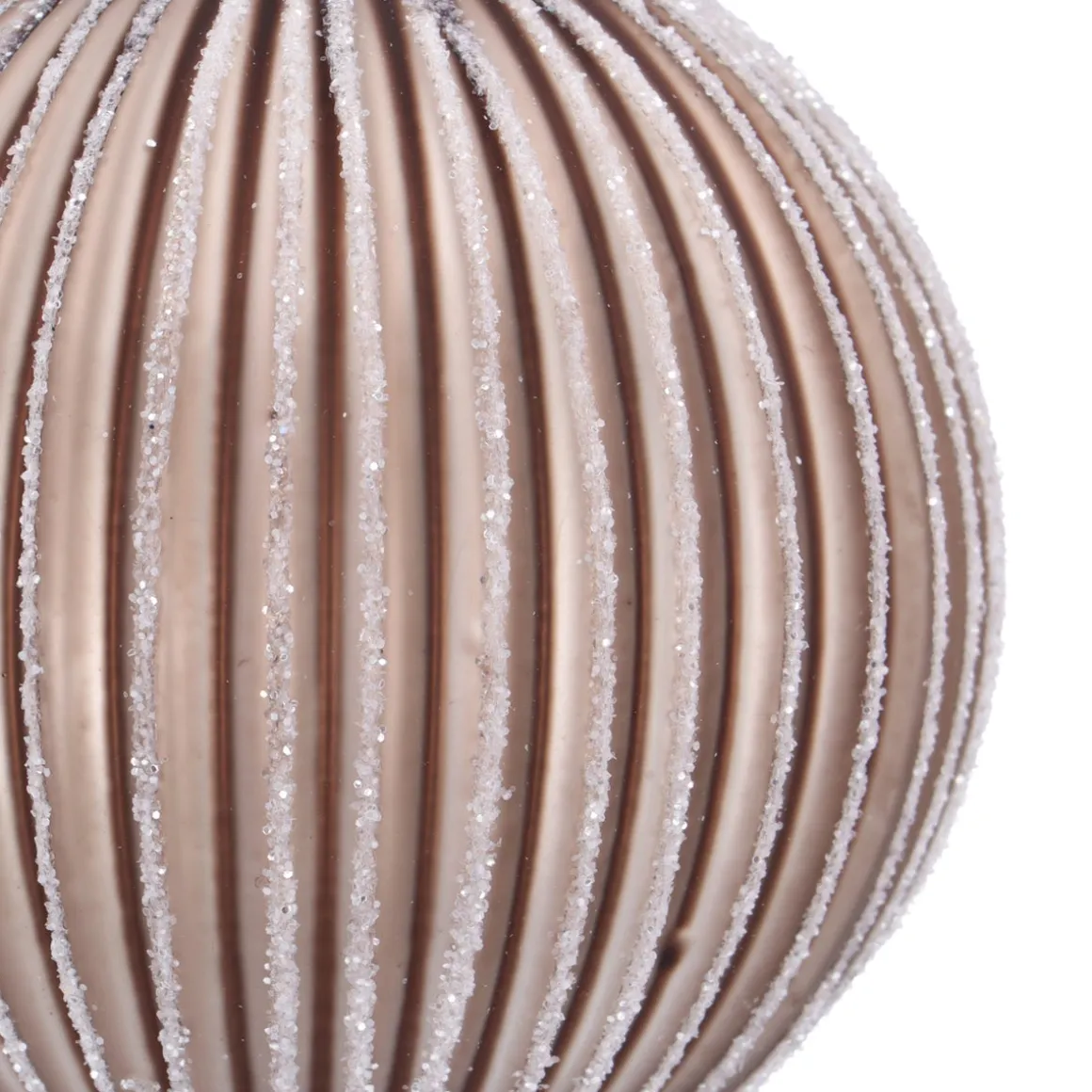 Deze glazen kerstbal van 8 cm is extra feestelijk dankzij het lampionreliëf. De taupekleur en handaangebracht glitterlijnen brengen een verfijnde en feestelijke sfeer in huis. Het zilveren draadje maakt het makkelijk om de bal een plekje in je boom te geven.
