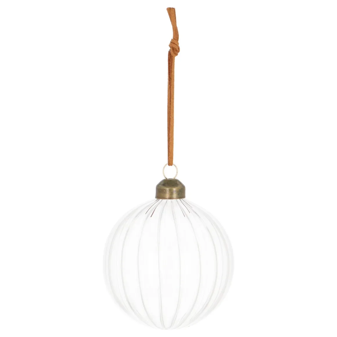 De glazen, transparante kerstbal heeft een diameter van 8 cm en een subtiel reliëf. De lijnen sluiten mooi aan bij het minimalistische design. En niet geheel onbelangrijk: deze kerstdecoratie is te combineren met elke kleur! En het ophangen gaat al net zo stijlvol met het stevige leren ophanglusje.