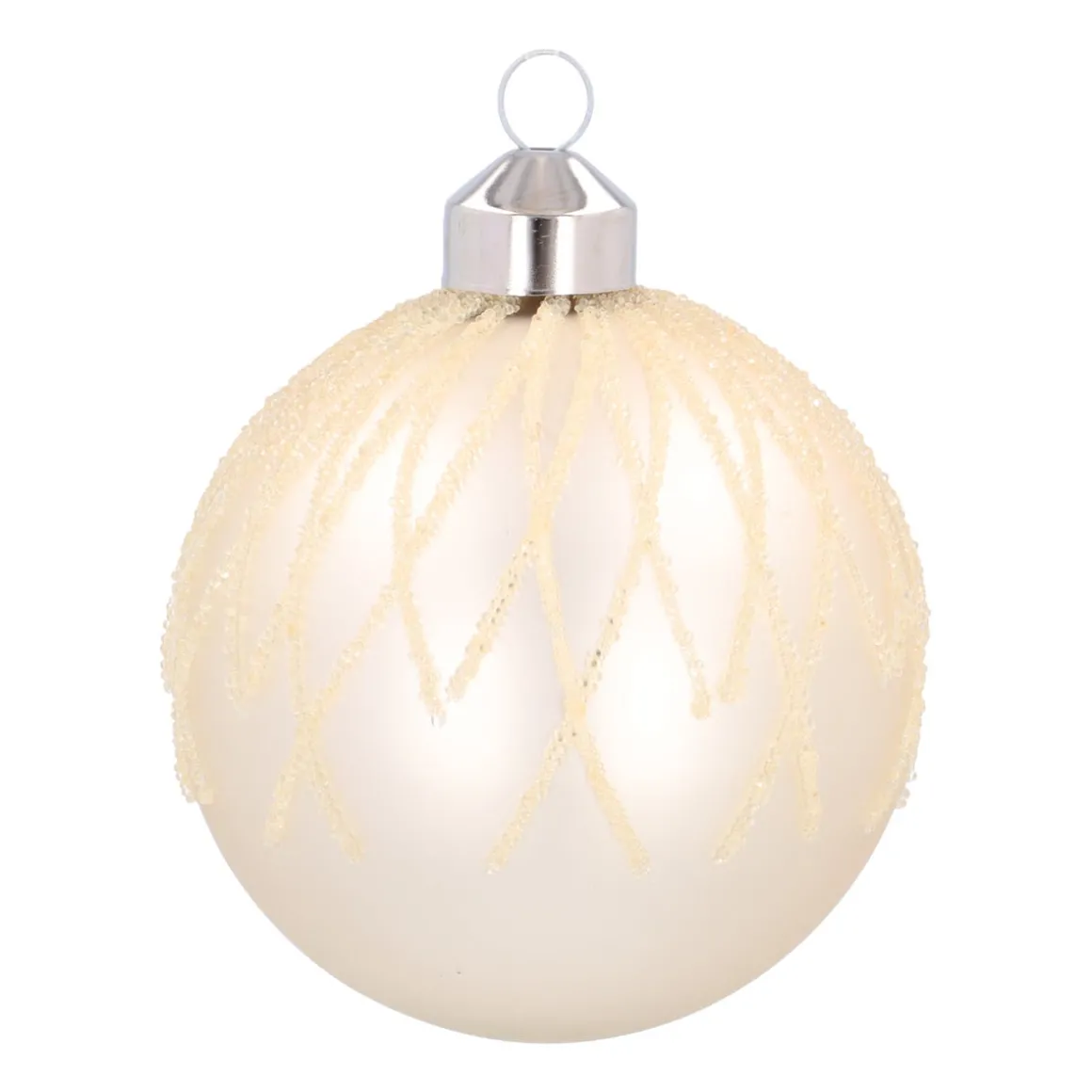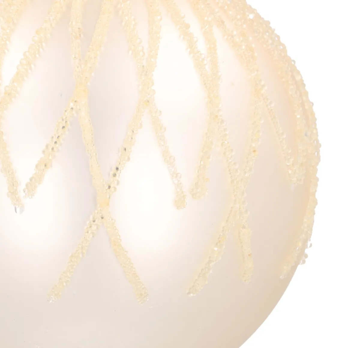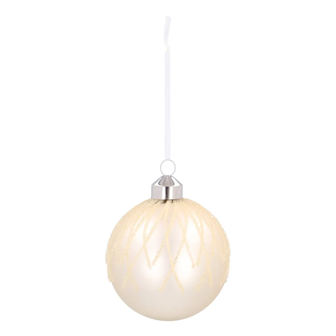 De kerstbal is met de hand gedecoreerd met dauwdruppels in een verfijnd lijntjespatroon. Het elegante witte organza lintje maakt het geheel af en zorgt voor een makkelijke bevestiging.