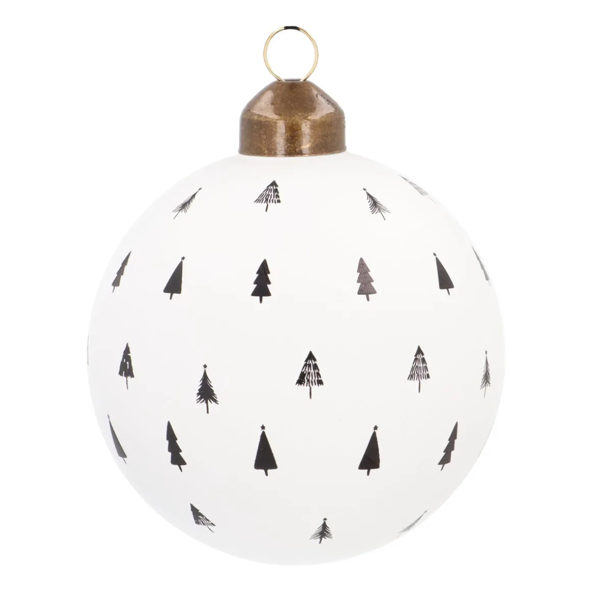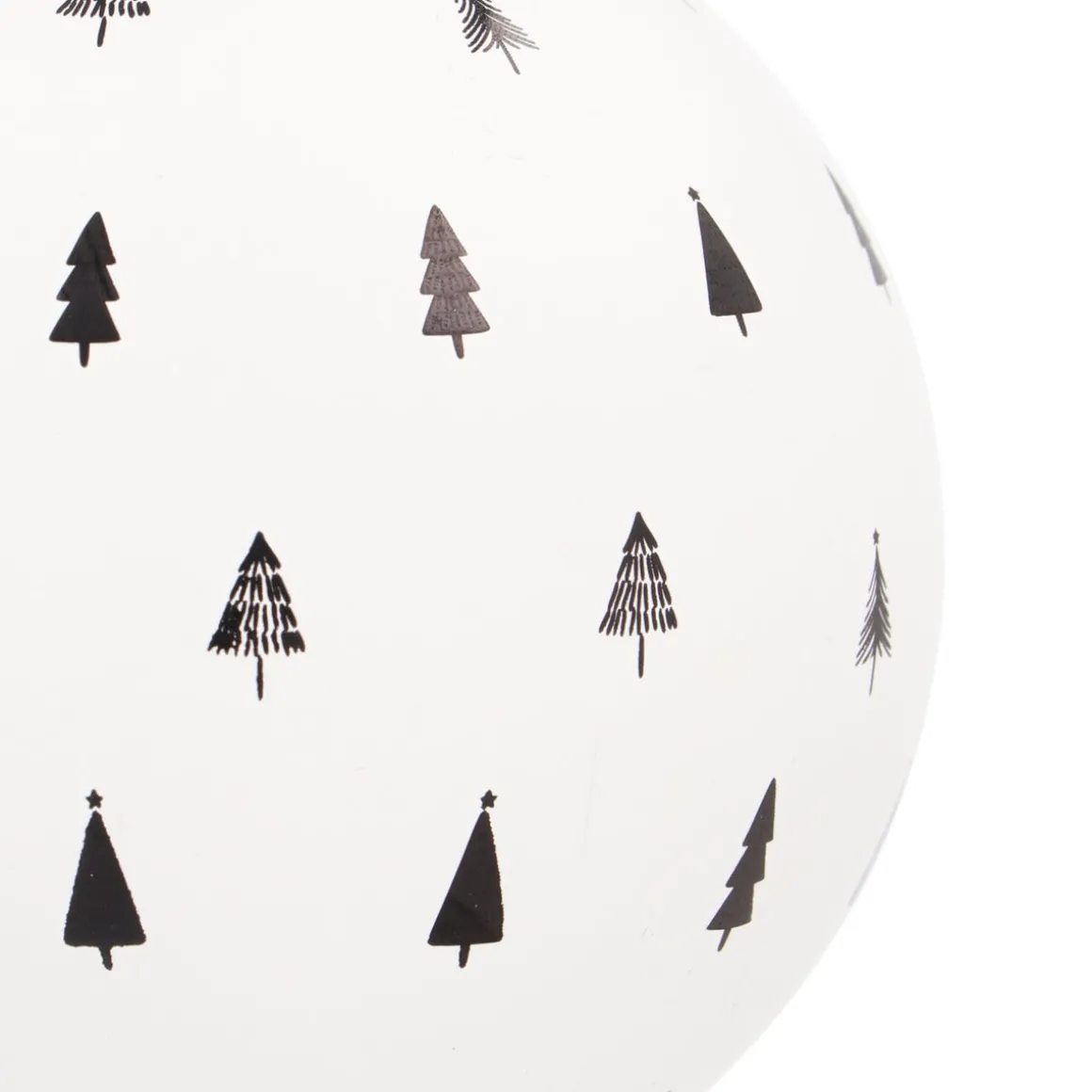 Deze matwitte glazen kerstbal heeft fijn uitgesneden kerstboompjes, waardoor de donkere binnenkant prachtig zichtbaar wordt. Dit zorgt voor een opvallend contrast, vooral wanneer de bal voor het raam hangt of tussen de kerstlampjes. Het stevige zwarte leren lusje voegt een stijlvolle en moderne detail toe.