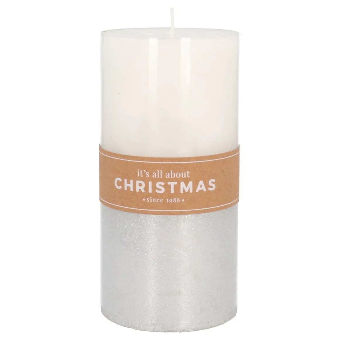 Elegante stompkaars in chique wit, voorzien van zilveren glitter. De kaars is 15 cm hoog en heeft een diameter van 7,5 cm. Een echte eyecatcher.