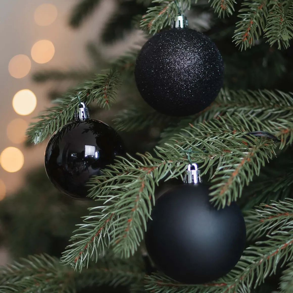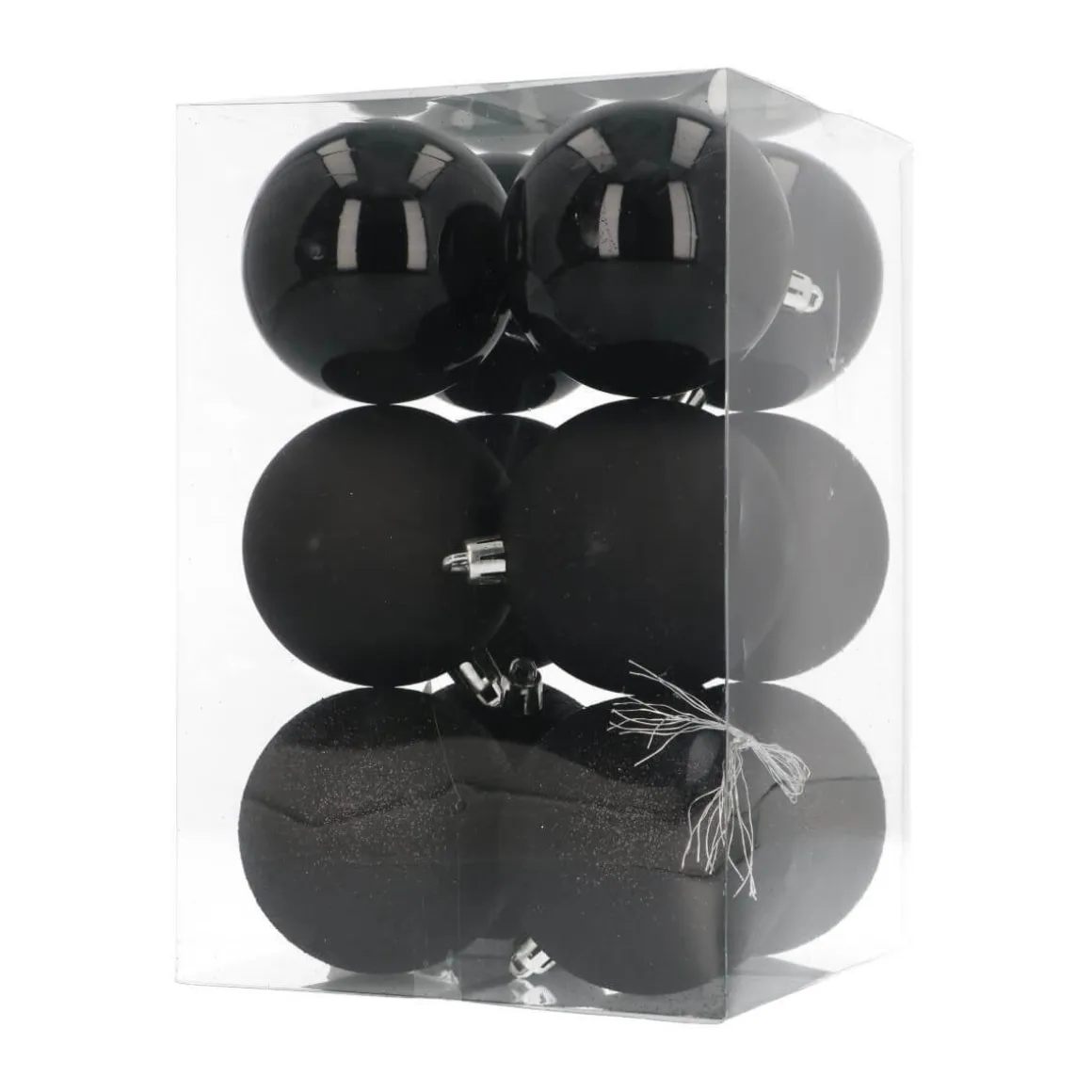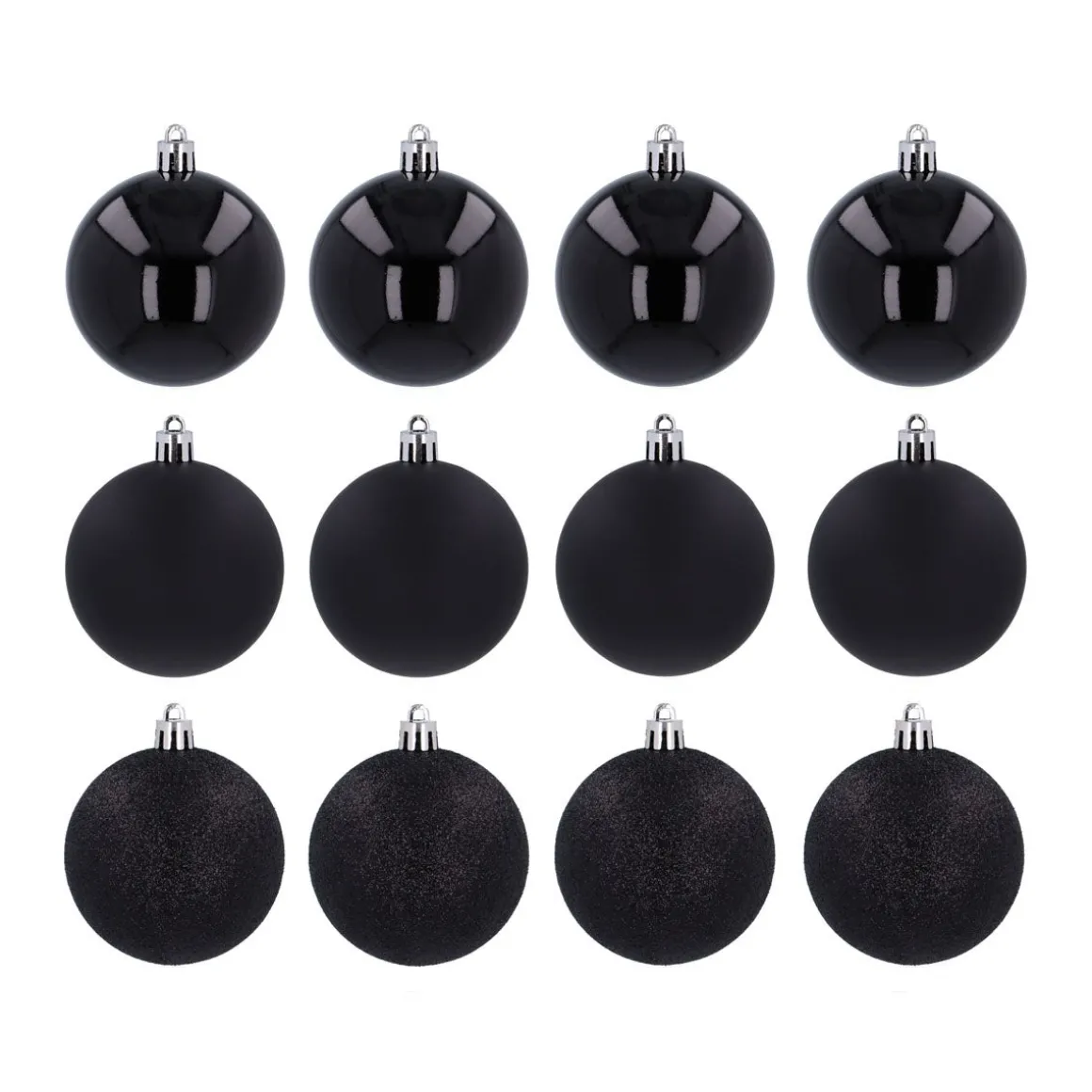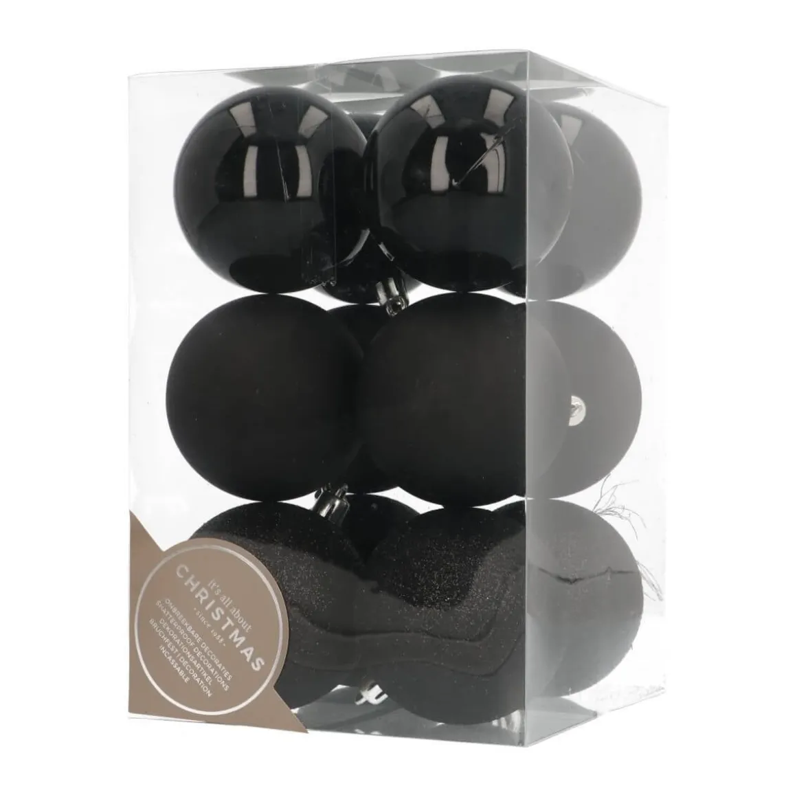 Mooie set van 12 kunststof kerstballen, zwart. De kerstballen hebben een doorsnede van 7 cm. Door meerdere sets te combineren, bijvoorbeeld met andere kleuren en maten, kun je je eigen unieke stijl creëren. Omdat ze van plastic zijn gemaakt, zijn ze praktisch onbreekbaar. Kleurcategorie: zwart.