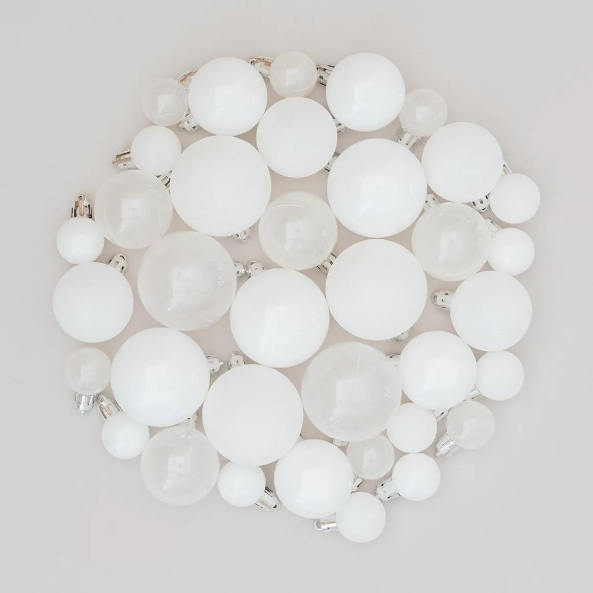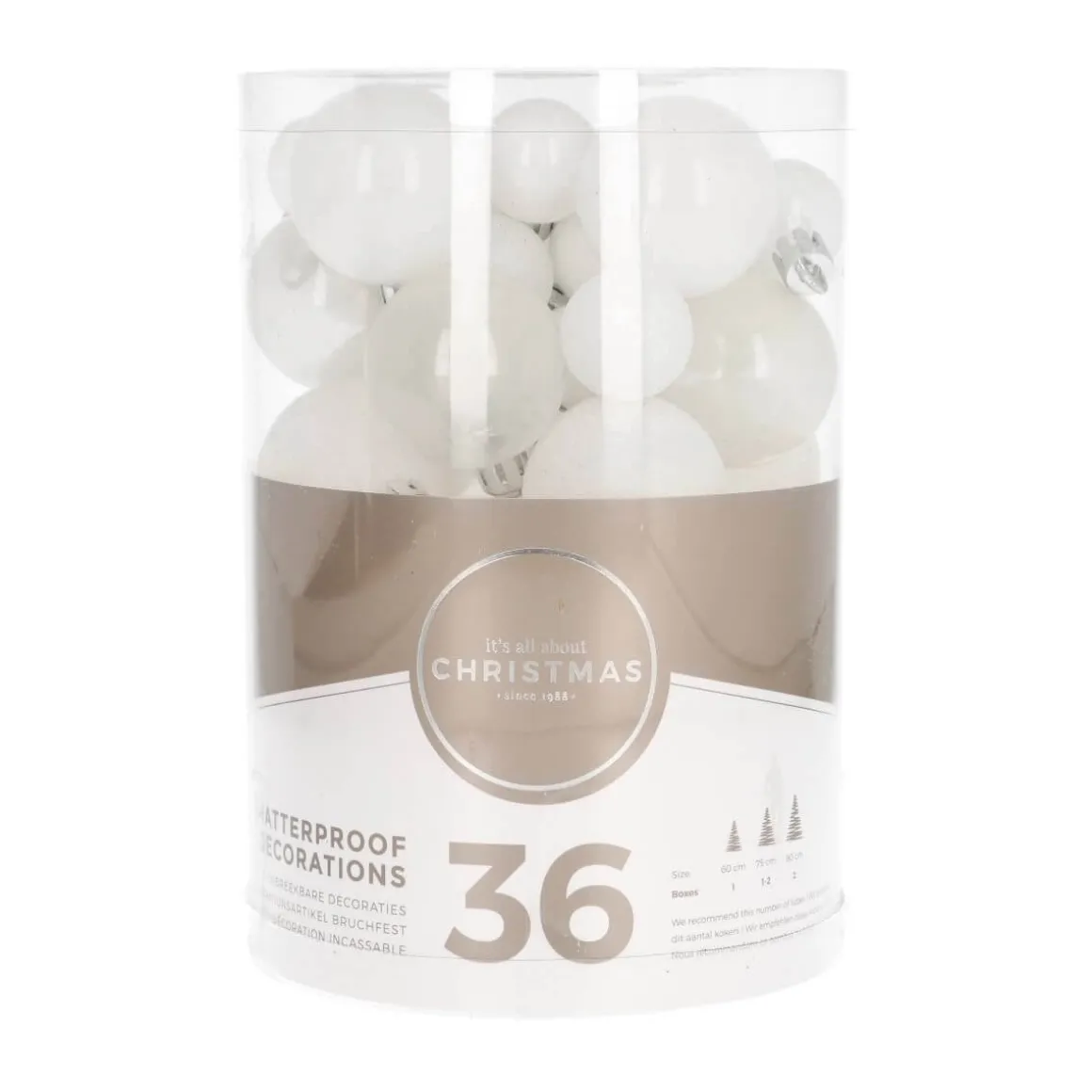 Zeer complete set van 36 kleine kunststof kerstballen, wit mix. De set bestaat uit 16 ballen met een doorsnede van 2,5 cm, 12 ballen van 4 cm, en 8 ballen van 5 cm. Gebruik meerdere sets in dezelfde kleur voor een rustige sfeer, of combineer met andere kleuren voor je eigen unieke stijl. Geleverd in een handige koker, waarin de kerstballen na de kerst veilig op te bergen zijn. Omdat de kerstballen van plastic zijn gemaakt, zijn ze praktisch onbreekbaar. Kleurcategorie: transparant, wit.