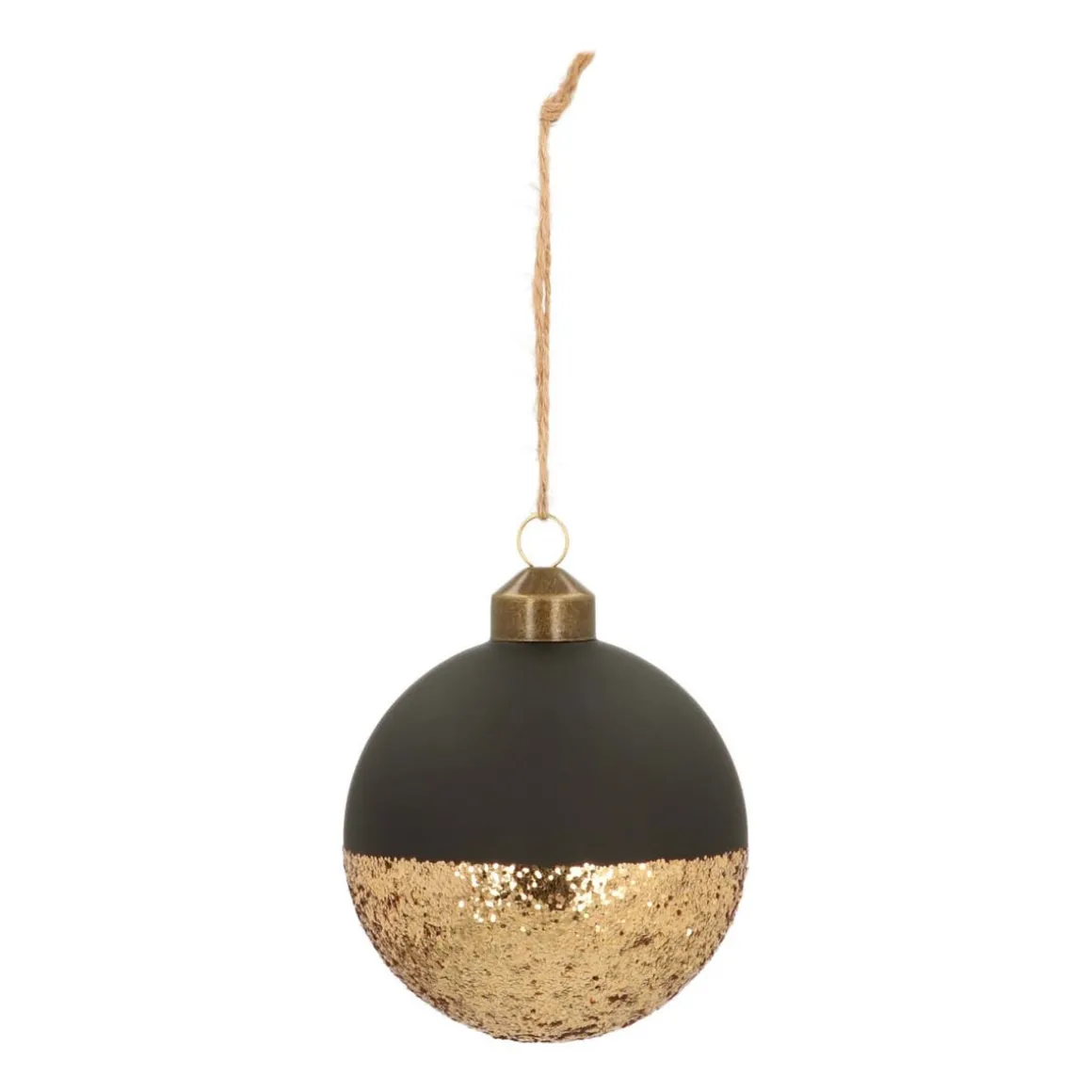 Zeer luxe en decoratieve glazen kerstbal van 8cm groot in mat zwart. Ter decoratie is de onderste helft van de kerstbal in gouden glitters gedipt. Een zeer exclusief product die met de hand is gedecoreerd. Deze prachtige kerstbal is te bestellen in sets van 2 stuks.