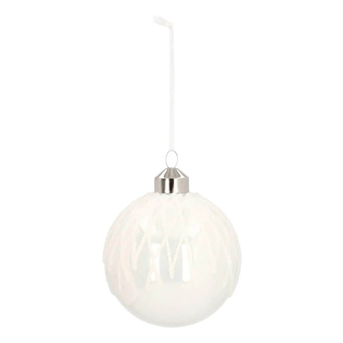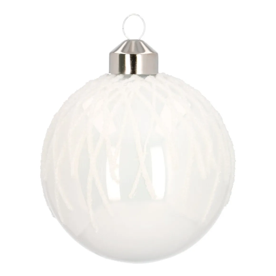 Zeer luxe en decoratieve glazen kerstbal van 8cm groot in glanzend wit, met witte fijne lijntjes als design. Een zeer exclusief product die met de hand is gedecoreerd. Deze prachtige kerstbal is te bestellen in sets van 2 stuks.
