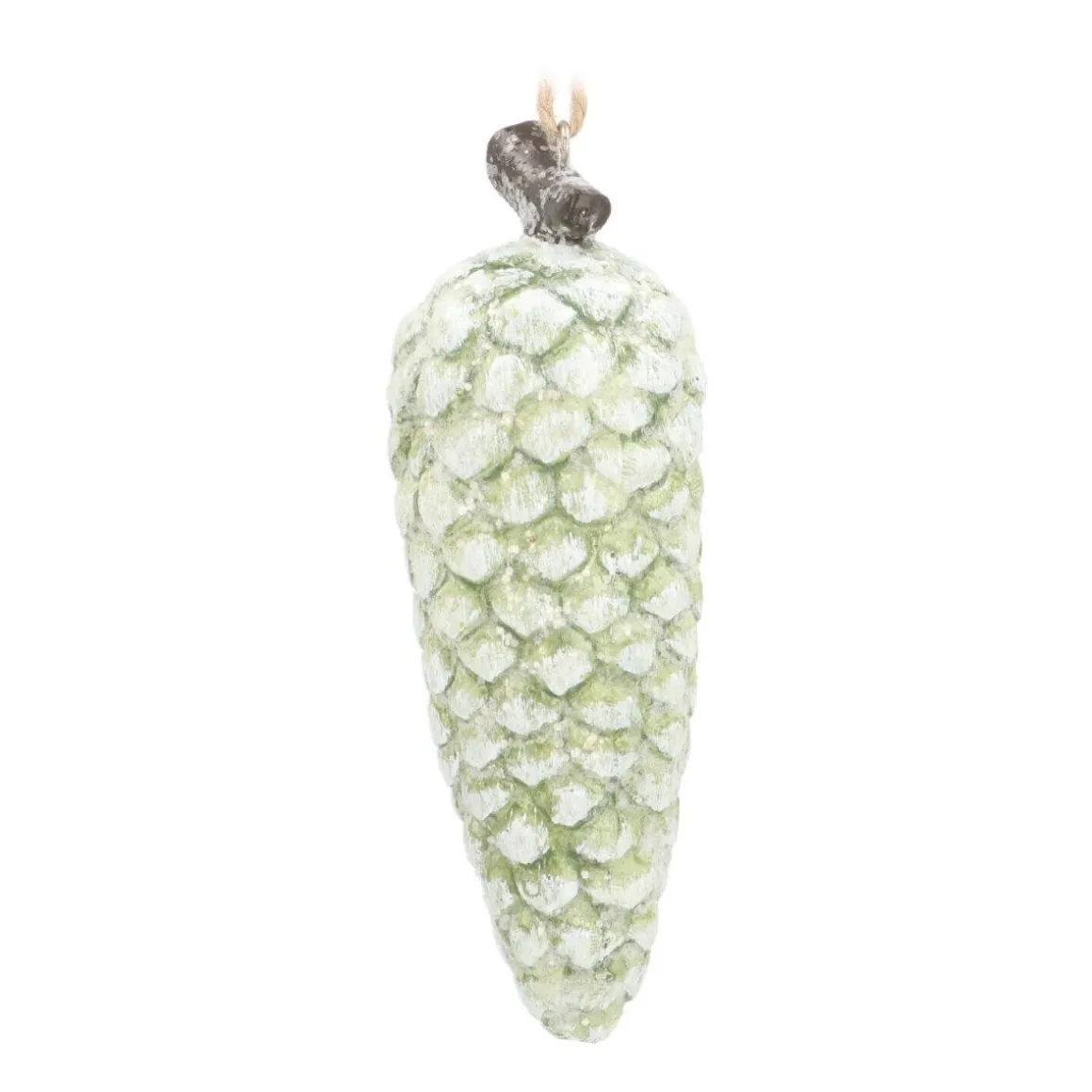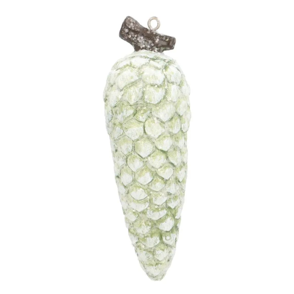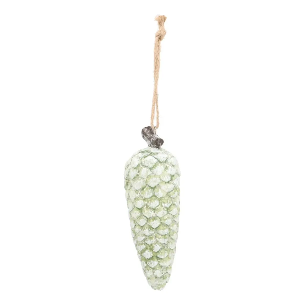 Unieke kerstboomhanger in de vorm van een dennenappel. Deze hanger is gemaakt van kunststeen (polyresin), en is zo’n 4x4x13 cm groot. Eenvoudig te combineren en een mooie toevoeging aan de kerstboom.