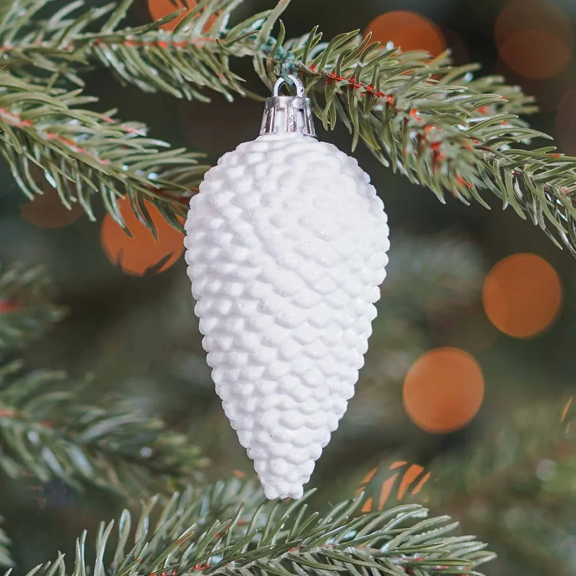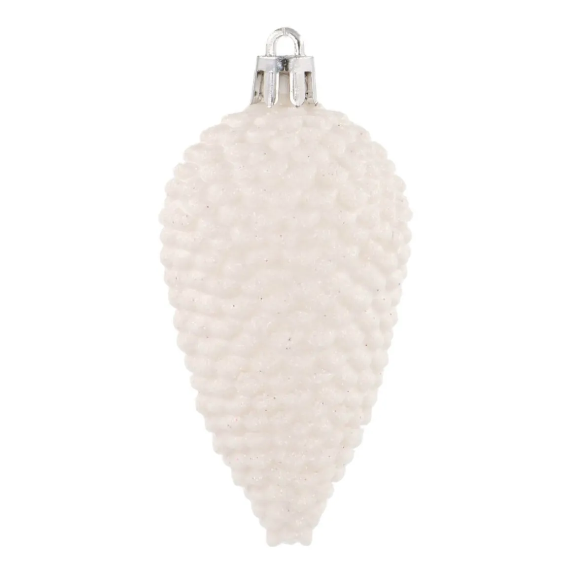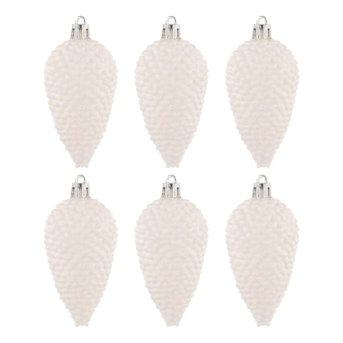 Een mooie set van 6 kunststof dennenappels in de kleur wit. Ze hebben de vorm van de traditionele dennenappel maar zijn versierd met glitter voor een extra speciale en feestelijke look!