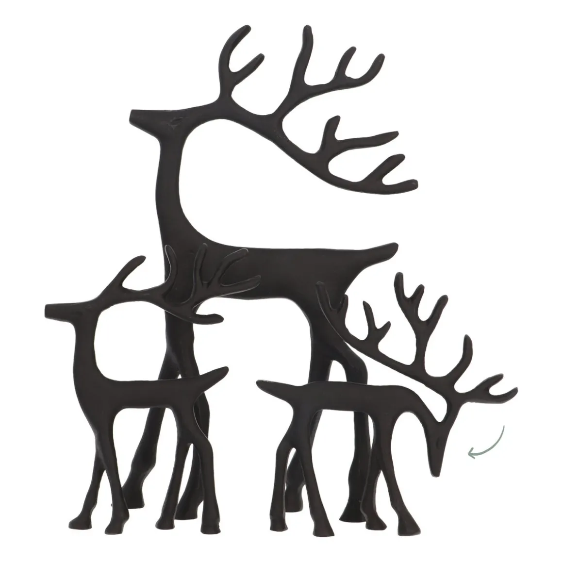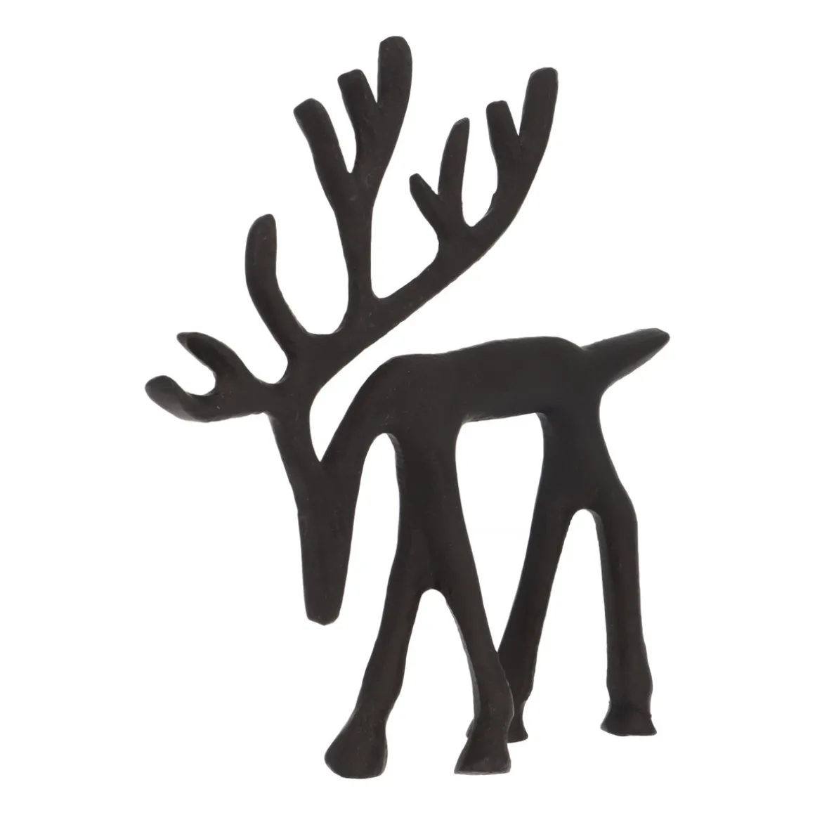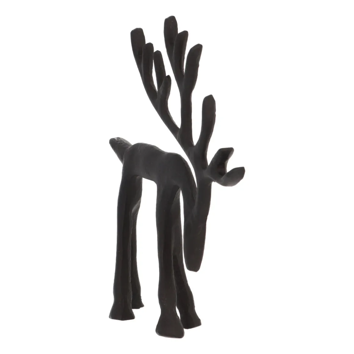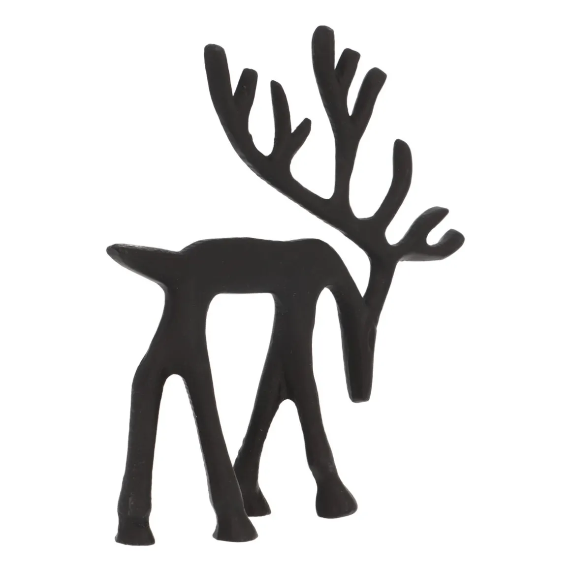 Dit zwarte rendier, gemaakt van aluminium, met zijn kop speels omlaag, brengt meteen de sfeer in huis. Of je het nu in een kast, op tafel, op de vensterbank, of onder de kerstboom plaatst, dit rendier trekt meteen de aandacht. Combineer het met de variant waarbij het rendier zijn kop omhoog heeft voor een prachtig duo. Voeg wat dennengroen of een laagje nepsneeuw toe voor een extra feestelijke touch!