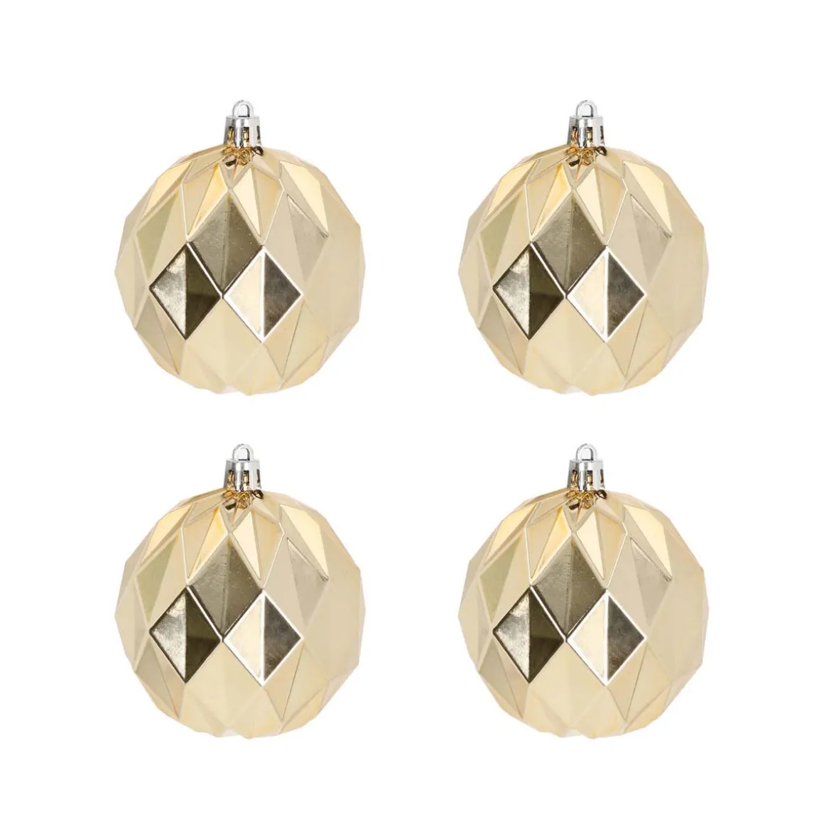 Mooie set van 4 kunststof kerstballen met geometrische vormen in de kleur lichtgoud. De kerstballen hebben een doorsnede van 8 cm en hebben dankzij hun hoekige uiterlijk een stoere uitstraling.
