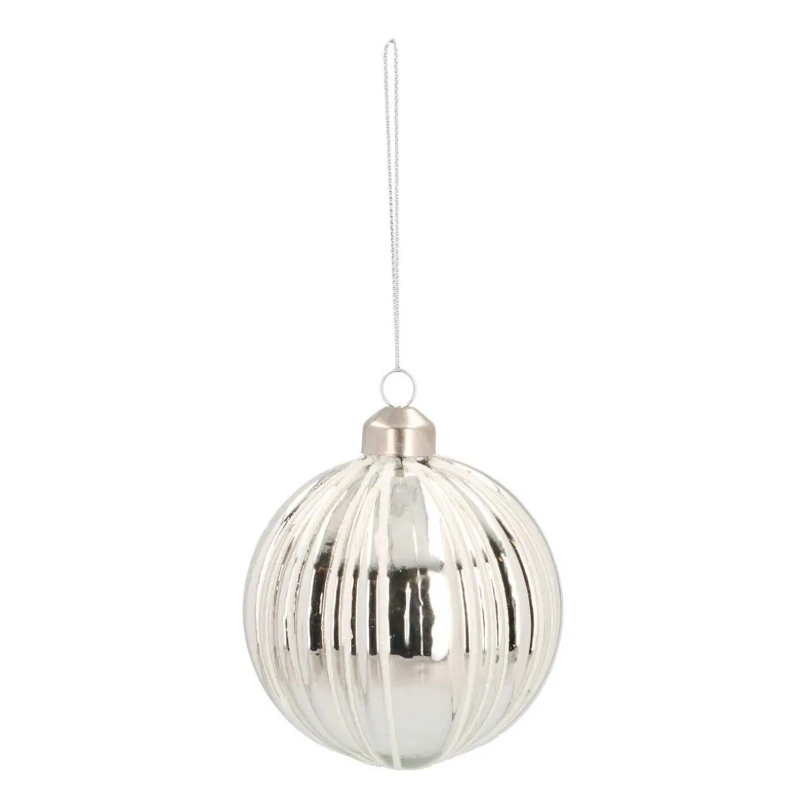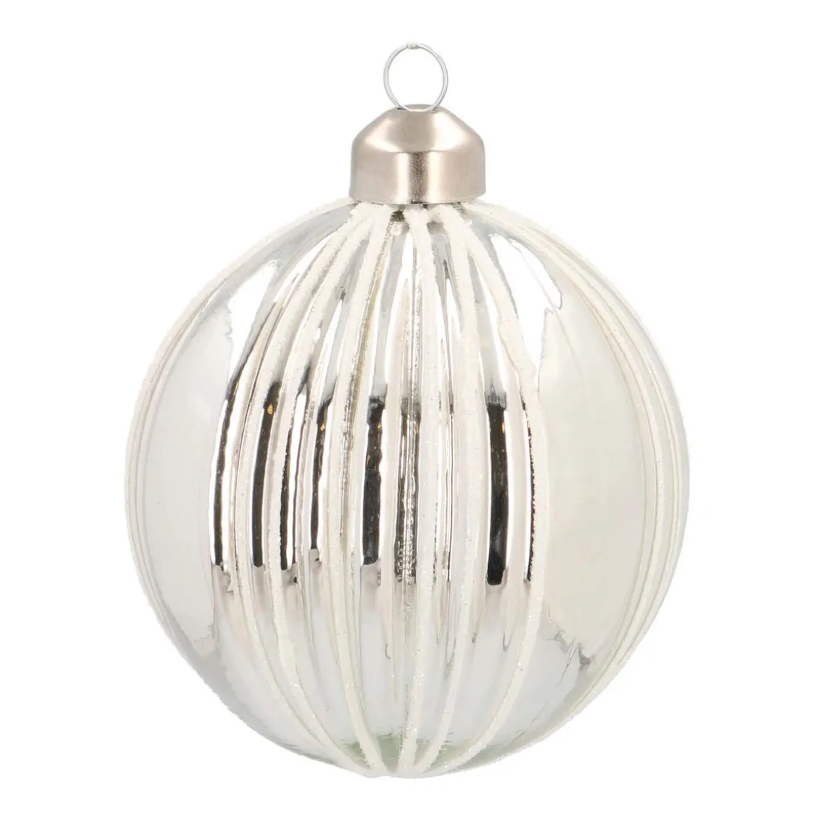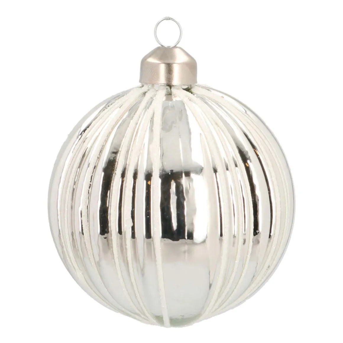 Glazen kerstbal in mooie zilveren kleur, voorzien van stijlvolle lijnen. De lijnen zijn voorzien van een subtiel laagje glitter.
