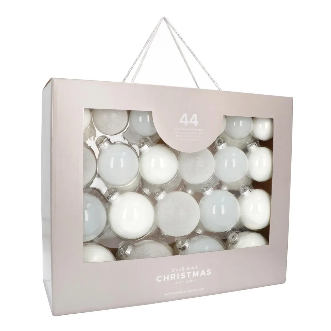 Hoge kwaliteit glazen kerstballen in prachtige kleuren wit. Geleverd in handige opbergkoffer.