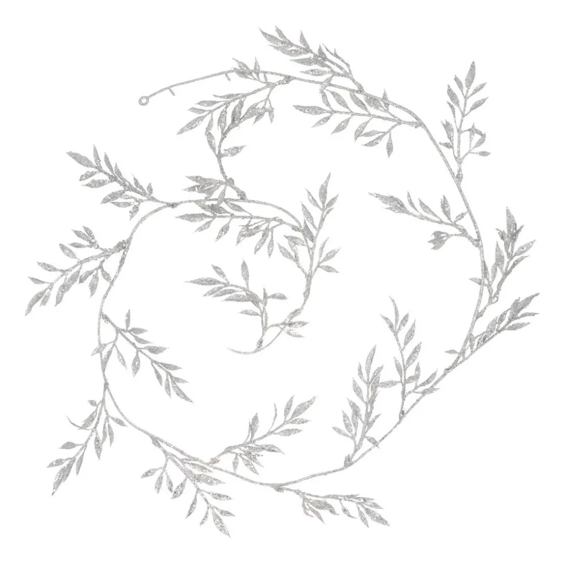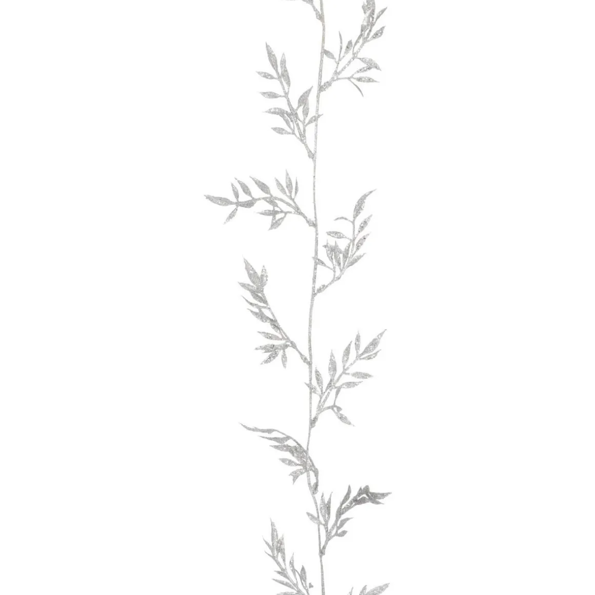 Decoratieve slinger met blaadjes, met een lengte van 260cm. De slinger is zilver, met glitter. Mooi te combineren met onze glitterornamenten.