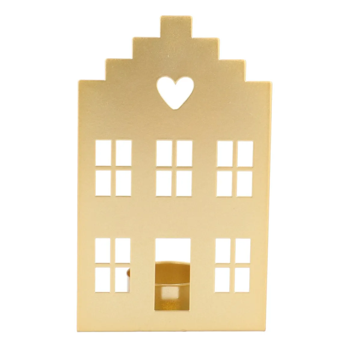 Een typisch Nederlands grachtenpandje voor een waxinelichtje. Gemaakt van goudkleurig metaal geeft het een feestelijke sfeer in huis. Perfect voor op de vensterbank, waar het een prachtig silhouet vormt. Zeker als je er ’s avonds een waxinelichtjes achter zet en ziet hoe het zachte licht door de ramen schijnt. Of zet het pandje in de kast of op een bijzettafeltje, door er wat dennentakken, nepsneeuw of andere kerstdecoratie aan toe te voegen heb je een mooi winters tafereel. Het grachtenpandje is ook een leuk kerstcadeau. Pak het mooi in en je weet zeker dat je er iemand blij mee maakt deze feestdagen.