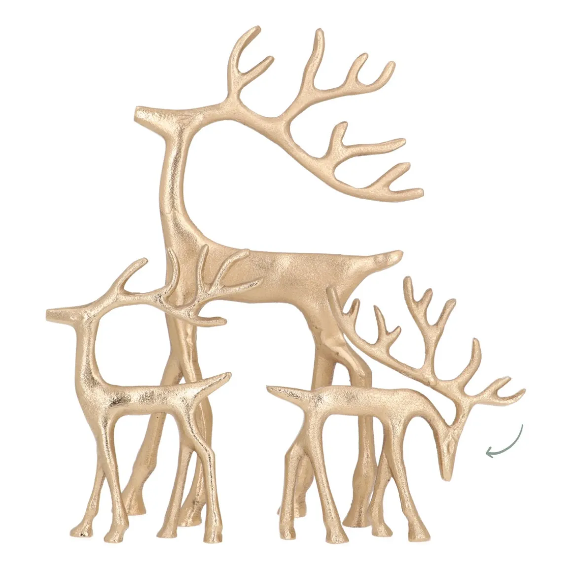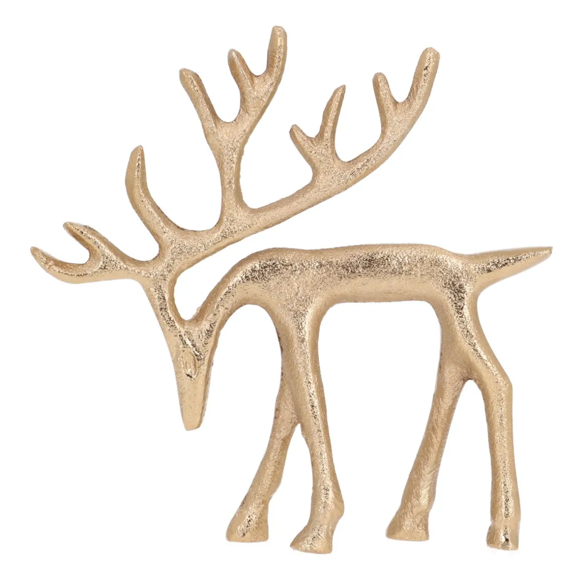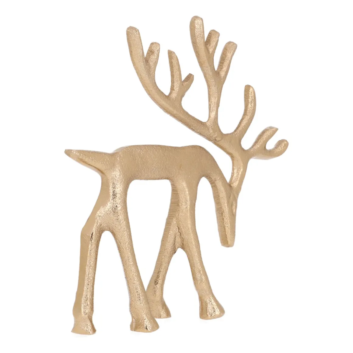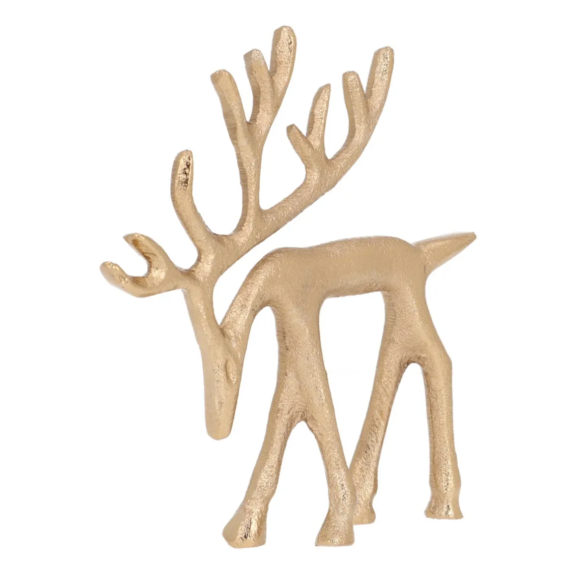 Dit charmante gouden rendier, gemaakt van aluminium, met zijn kop speels omlaag, brengt meteen de sfeer in huis. Of je het nu in een kast, op tafel, op de vensterbank, of onder de kerstboom plaatst, dit rendier trekt meteen de aandacht. Combineer het met de variant waarbij het rendier zijn kop omhoog heeft voor een prachtig duo. Voeg wat dennengroen of een laagje nepsneeuw toe voor een extra feestelijke touch!