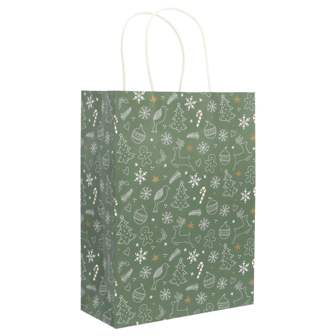 Het tasje is 24 cm hoog en gemaakt van stevig groen papier, voorzien van twee handige handvaten. Onze designers hebben de buitenkant versierd met vrolijke witte kerstfiguurtjes, en de gouden sterretjes maken het helemaal af! Deze originele verpakking biedt voldoende ruimte voor kleine tot middelgrote cadeautjes. En vergeet niet: combineer het met ons bijpassende cadeaupapier voor extra feestelijke flair… 😉 Dubbel plezier onder de kerstboom gegarandeerd!