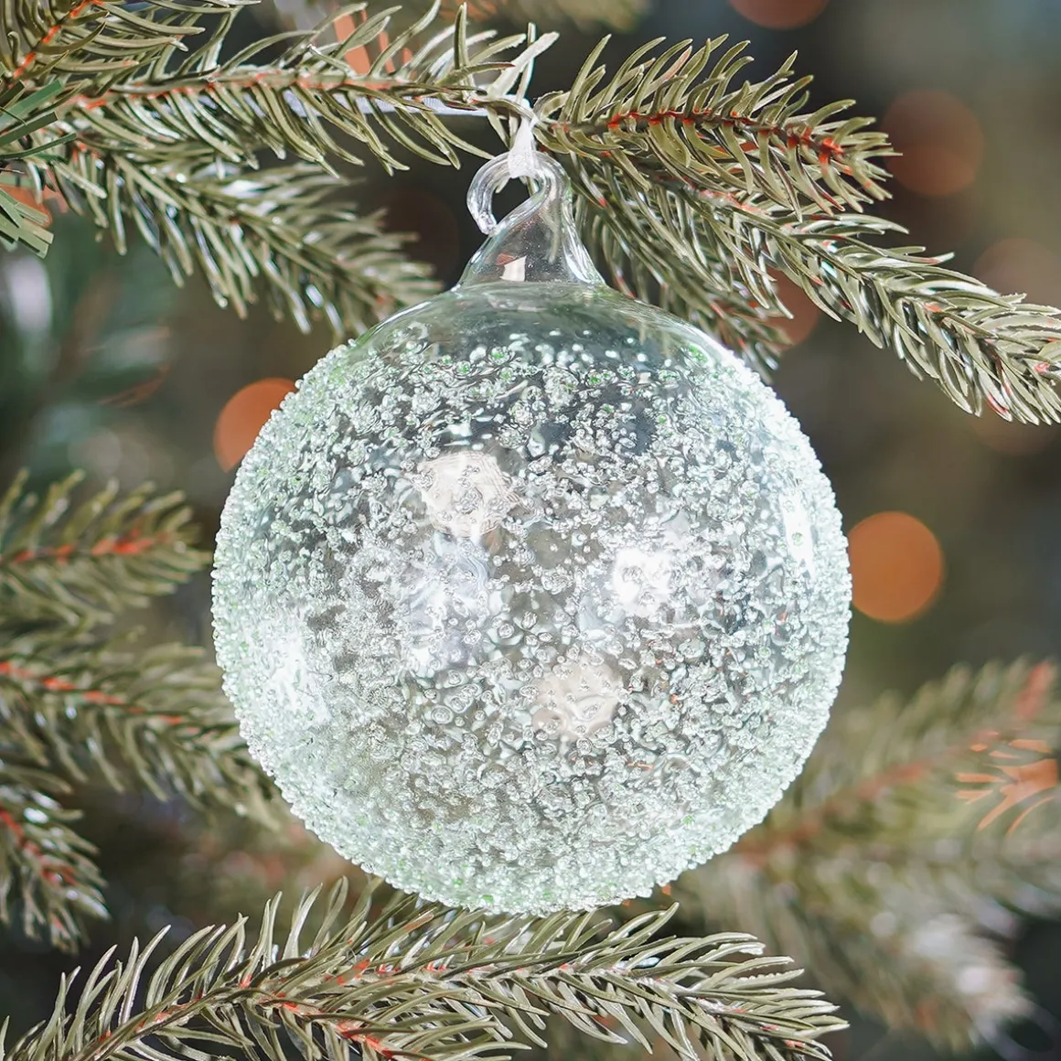 De groene, glanzende transparante bal is geblazen uit één stuk glas. Deze sfeervolle kersthanger heeft daarom geen metalen onderdelen, maar een verfijnd glazen oogje. Ophangen gaat eenvoudig met het sierlijke lintje, extra kerstbalhaakjes zijn dus niet nodig. De glazen spikkels vangen het licht en laten de kerstbal extra schitteren! Leuk detail: met zijn diameter van 10 cm is deze groene kerstbal ook mooi als raamdecoratie.