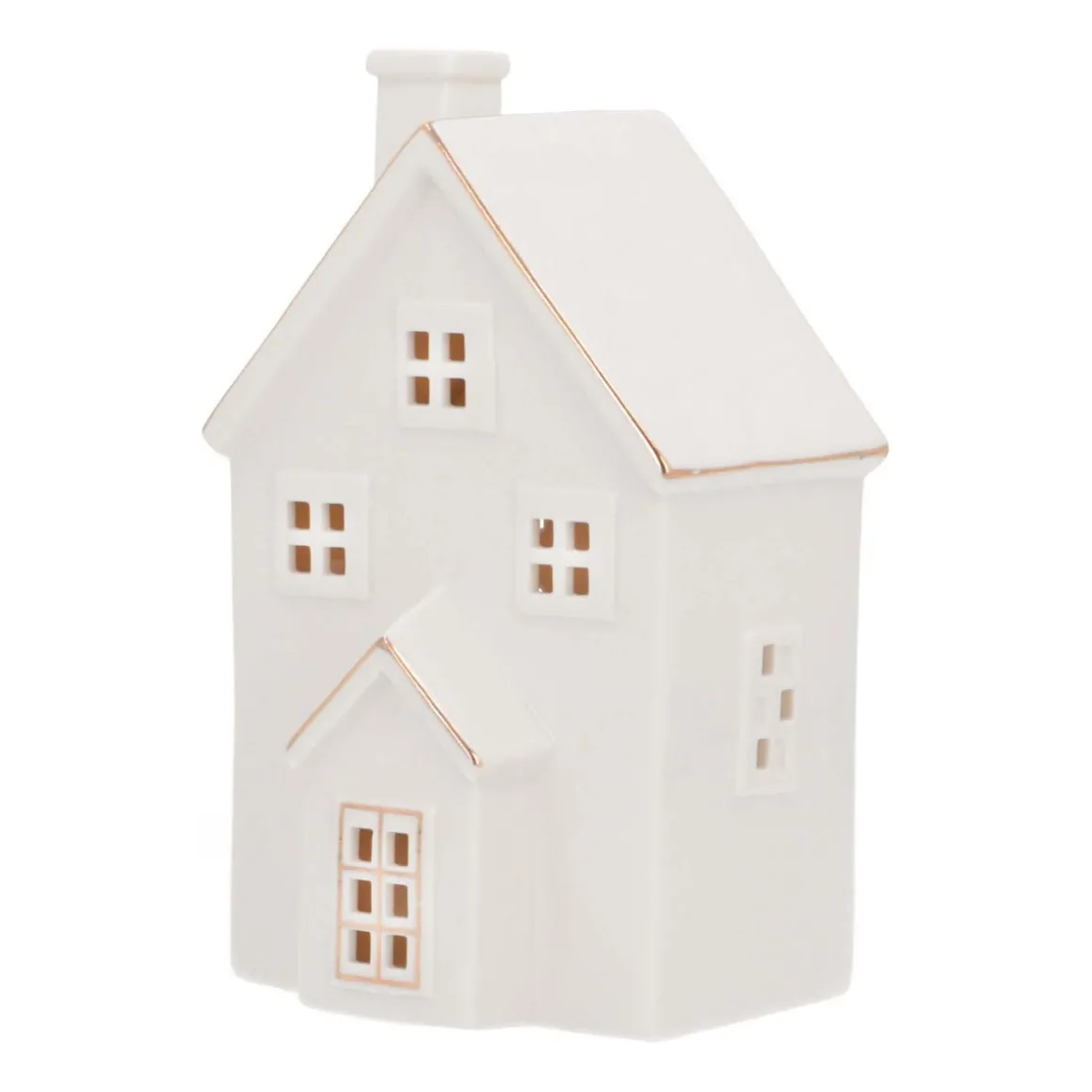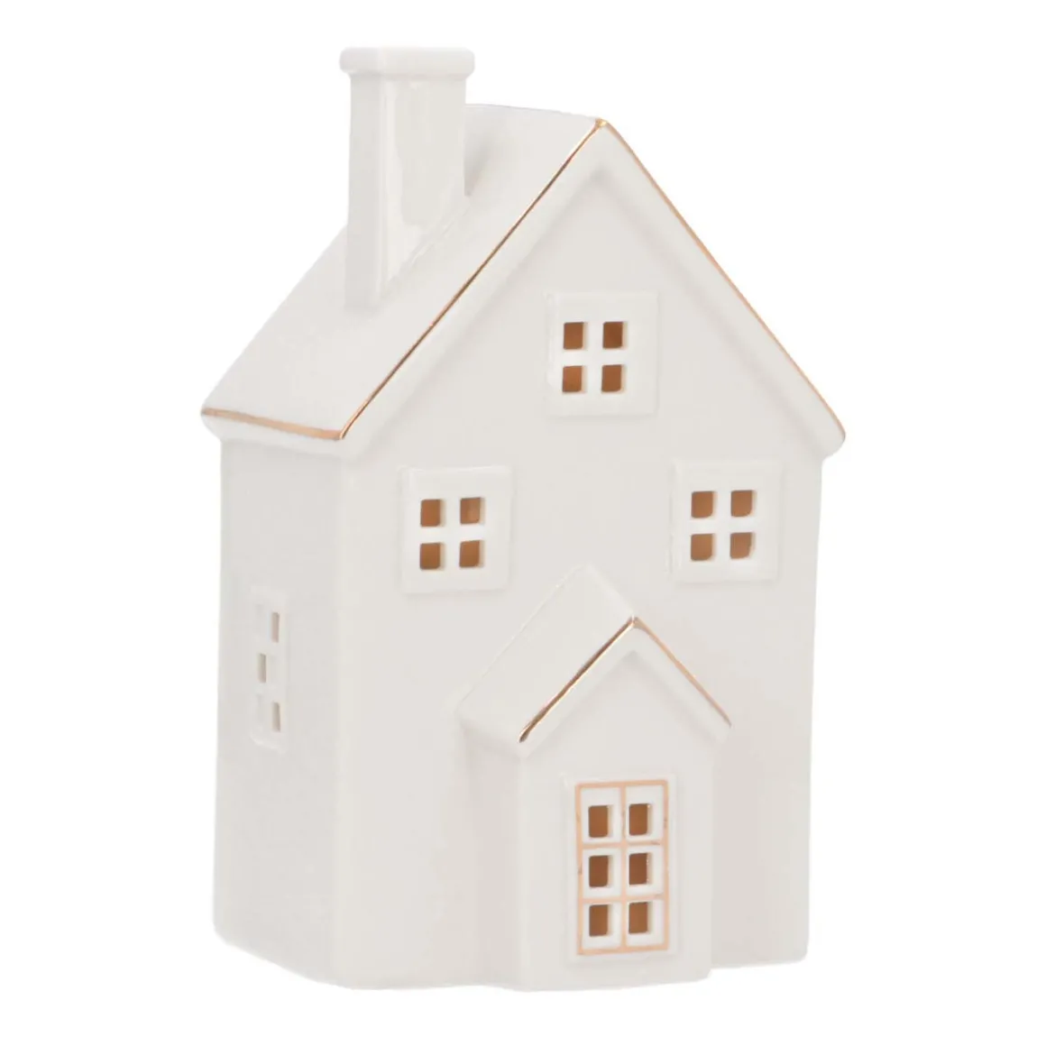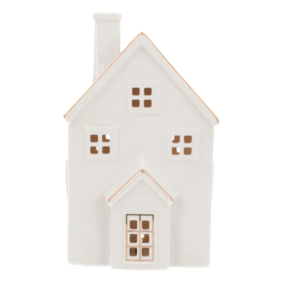 Laat je woonkamer schitteren met dit prachtige witte porseleinen huis met led-verlichting! Met een hoogte van 20cm en inclusief batterijen is dit huisje klaar om je kerstsfeer te verlichten. Dit witte huis heeft een gouden randje langs de dakgoot wat het een extra touch geeft.