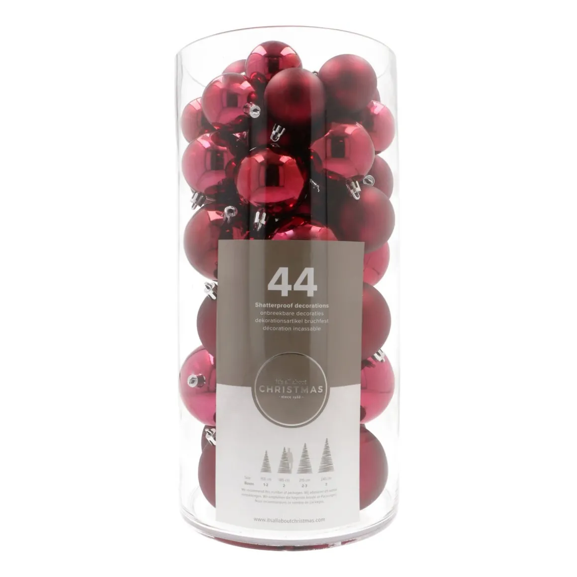Complete set van 44 kunststof kerstballen in prachtig bordeauxrood. De set bevat matte en glanzende ballen en wordt geleverd in een handige opbergkoker.