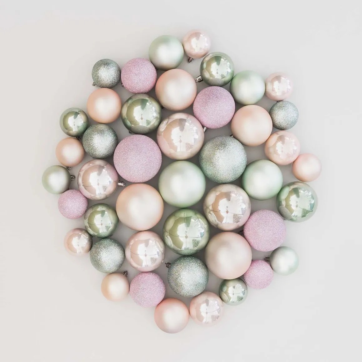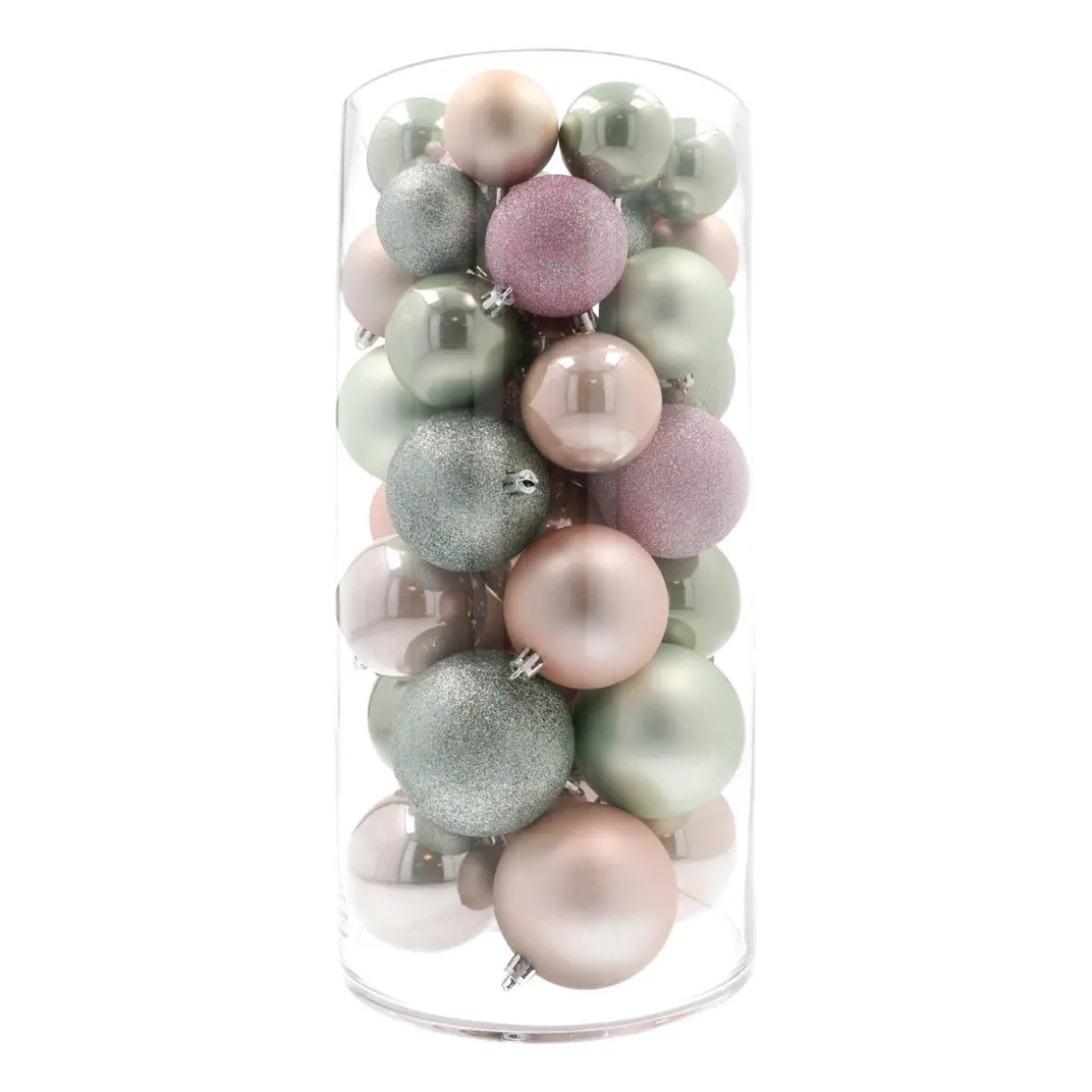 Complete set van 44 kunststof kerstballen in prachtige ‘Romantic’ mix. De set bevat matte, glitter en glanzende ballen en wordt geleverd in een handige opbergkoker.