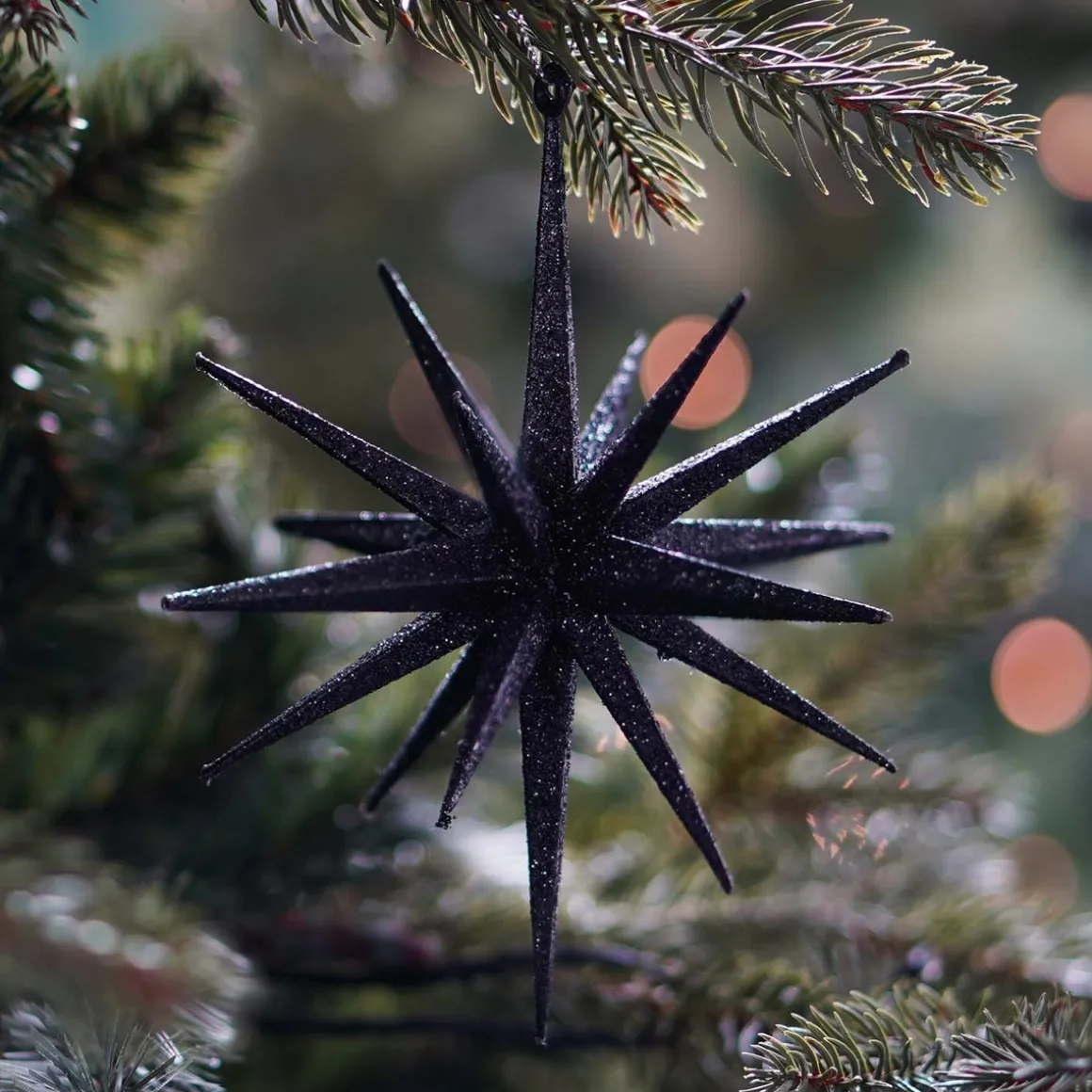 Stijlvolle kunststof kersthanger van een geometrische ster in 3D. Met zijn zwarte kleur en mooie glitters een echte blikvanger.
