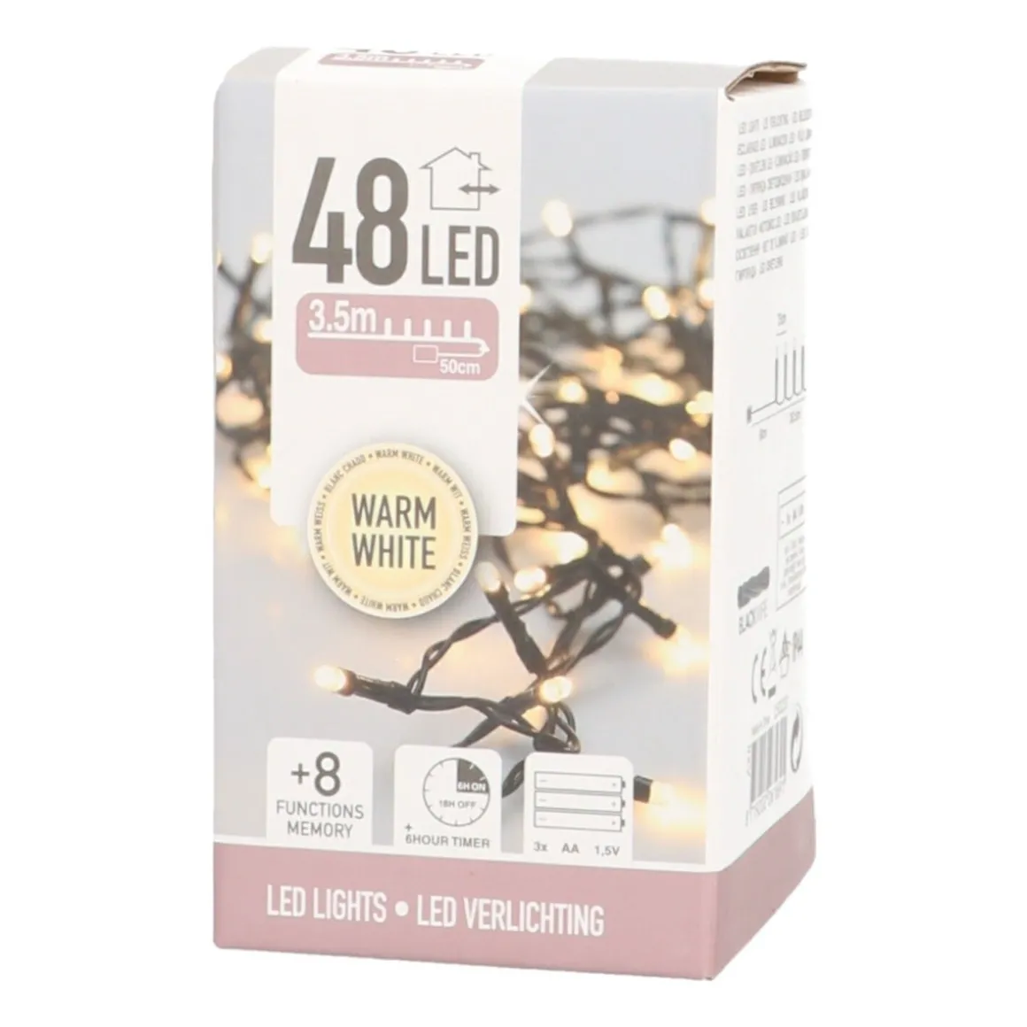 Snoerverlichting met 48 LED lampjes, op batterijen (AA, excl.). De lampjes hebben een warm witte kleur, en het snoer is zwart. Het verlichte gedeelte van het snoer is ongeveer 3,5 meter lang, en het aanloopsnoer is 50 cm lang. Voorzien van een IP44 aansluiting en daardoor ook geschikt voor gebruik buiten. Inclusief een timer en een functiemodule voor onder andere knipperen en twinkelen.
