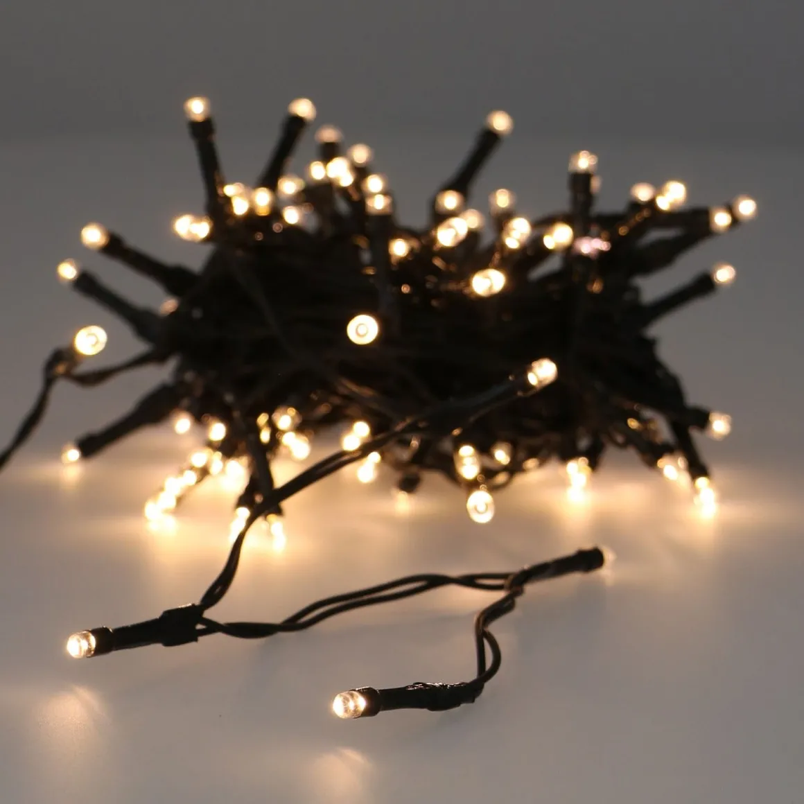 Snoerverlichting met 96 LED lampjes, op batterijen (AA, excl.). De lampjes hebben een warm witte kleur, en het snoer is zwart. Het verlichtte gedeelte van het snoer is ongeveer 7 meter lang, en het aanloopsnoer is 50 cm lang. Voorzien van een IP44 aansluiting en daardoor ook geschikt voor gebruik buiten. Inclusief functiemodule voor onder andere knipperen en twinkelen.
