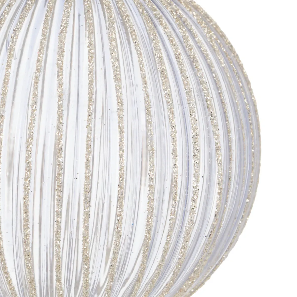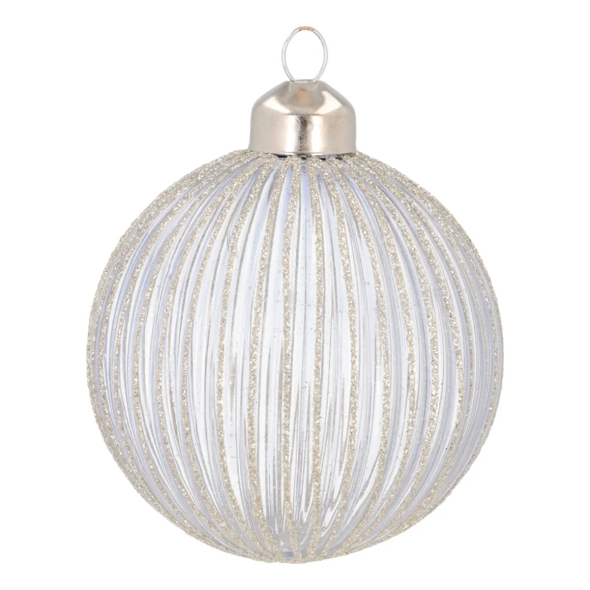 Deze transparante glazen kerstbal heeft een diameter van 8 cm en is gevormd in een elegant lampionreliëf. Dit reliëf en de zilveren glitters geven extra glamour aan je kerstboom. De strepen en de glitters en worden namelijk extra benadrukt door de kerstlampjes. Het standaard kerstboomhaakje heeft bij dit exemplaar plaats gemaakt voor een jute touwtje. Leuk detail: de vele glitters zijn met de hand op het glas aangebracht, dus elke bal is anders!
