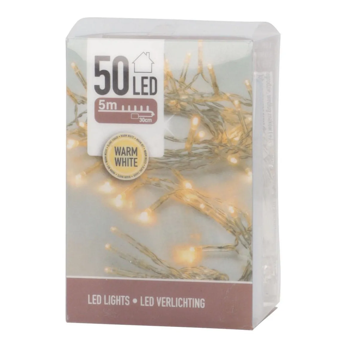 Sfeervolle, warm-witte LED lampjes. Dit snoertje met 50 LED lampjes zorgt voor een prachtig licht in je mini-kerstboom of doe-het-zelf decoratie.