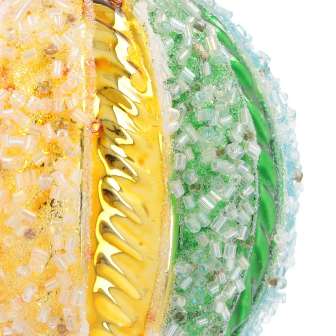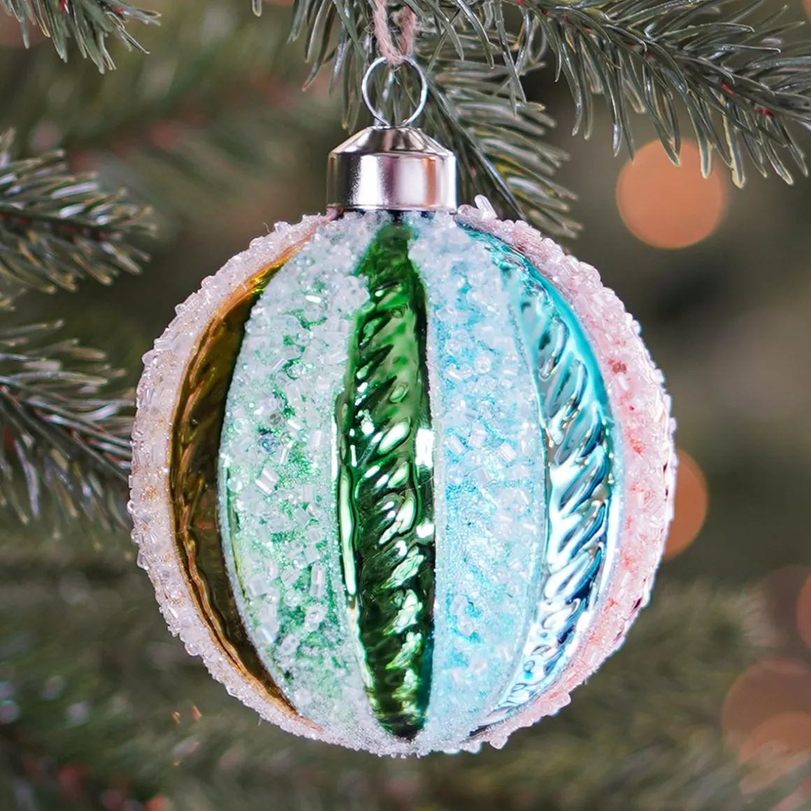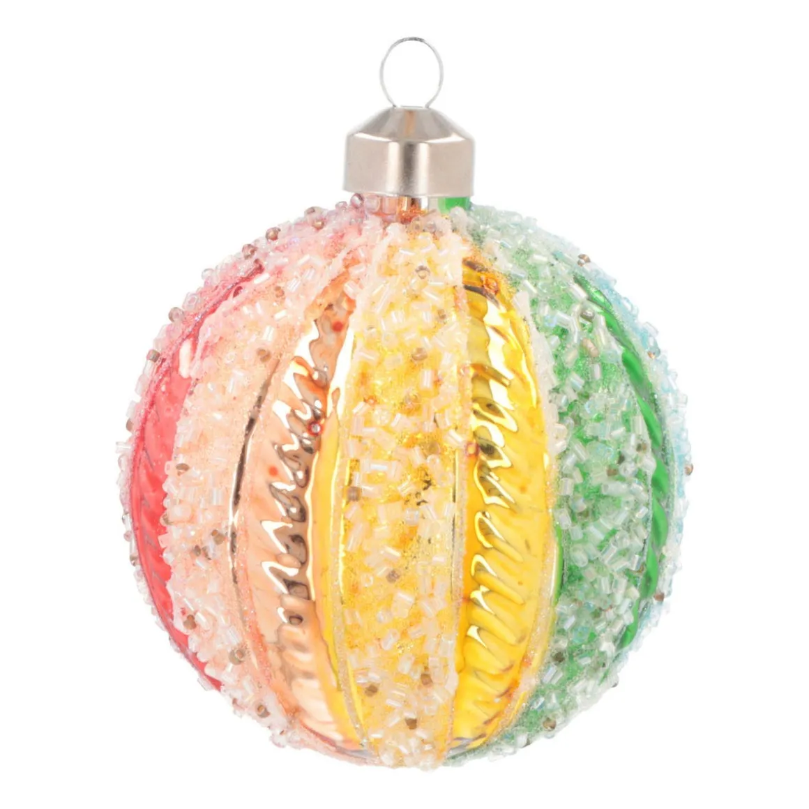 Deze prachtige bal straalt in zijn verschillende kleuren en is versierd met glinsterende pareltjes en glitteraccenten. Met zijn verticale strepen en reliëfpatroon creëert deze multikleurige kerstbal een stijlvolle en elegante uitstraling. Gemaakt van hoogwaardig glas en met een diameter van 8 cm, voegt deze luxe kerstbal een vleugje glamour toe aan je feestelijke decor.