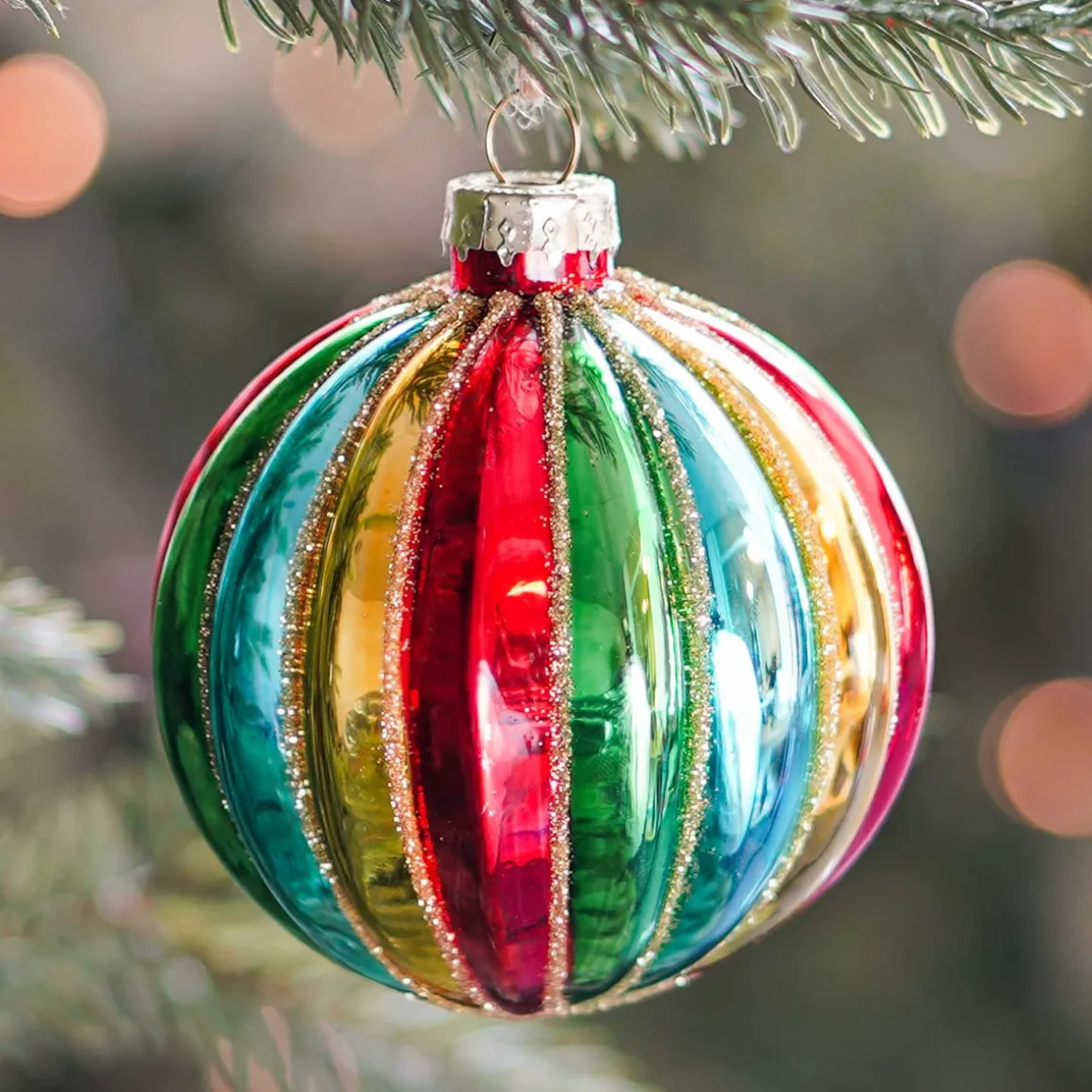 Creëer een uitbundige feestelijke sfeer met onze multikleurige kerstbal. Deze prachtige bal is voorzien van een gouden glitter afwerking die het licht vangt en doet schitteren. Met zijn verticale reliëfstrepen voegt deze bal textuur en diepte toe aan je kerstversiering. De combinatie van de levendige kleuren, glinsterende gouden glitter en verfijnde reliëfstrepen maakt deze bal een luxueuze toevoeging aan je kerstdecor.